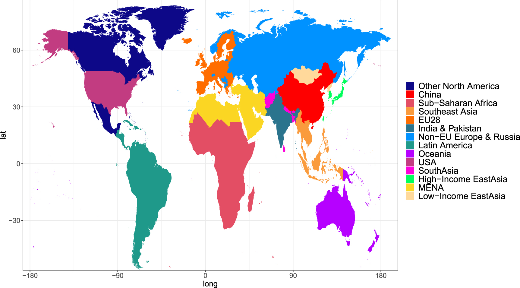 We use the GTAP V9 with the base year 2011. Because of the numerical and algorithmic limitations of the solver, it is necessary to aggregate the data. The aggregation needs to balance between two effects (Britz and van der Mensbrugghe 2016), the numerical and algorithmic constraints borne from numerical tools and the smoothing of yield shocks introduced through aggregation. Thus, we focus on 14 regions throughout the analysis while disaggregating each of these regions to the various AEZs (figure 1).