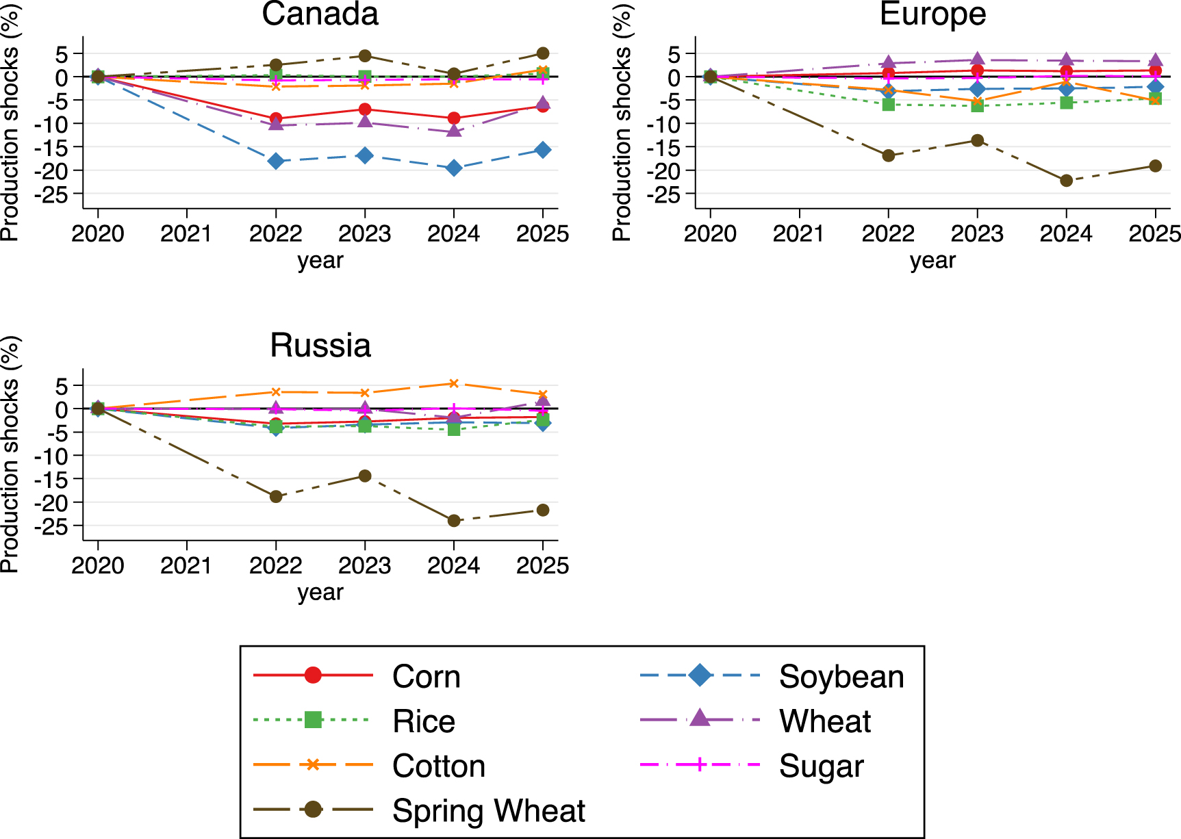 Changes in output and input prices cause production to shift and land allocation to change (input substitution). Large regional land productivity shocks to key commodities result in major disruptions. The third channel through which global markets adapt to the changes in land productivity is through international trade. We assume that there is no hoarding and trade proceeds as before the war to maximize profit. The exchange of goods and services among countries plays a vital role in reducing the negative effect of nuclear war on global agriculture supply systems. Through international trade, countries exploit the heterogeneity of the shocks among countries and reduce the negative effect of the nuclear war on agriculture. Returning to the CLM 5.0, we find land substitutes away from cotton and into corn and spring wheat. To better understand how changes in land impact crop production, we plot the analysis results in figure 4, which plots the outcomes for 2025 (see figure S5). These maps depict the change in food production in the various regions five years after a nuclear war. The short-run economic scenario results in output prices of corn and spring wheat increase substantially, which results in significantly more land allocated to these crops because the return to land used to grow these crops is now higher. The short-run scenario yields larger productivity shocks and more significant price spikes.