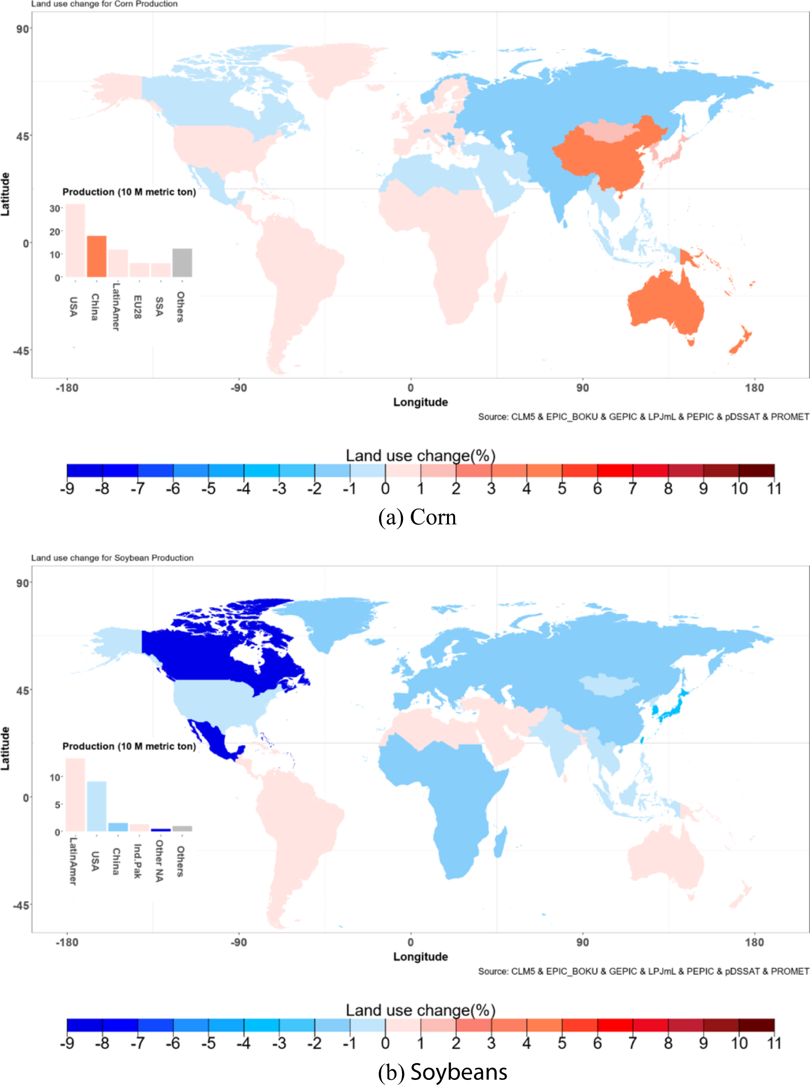 Output and land prices yield a shift in allocation of land and crop production. One example is the land productivity shock to cotton and how economic behavior responds to the positive shock to cotton (recall that cotton production under the crop model increases by 5% and more, yet under the Envisage-NW model it basically declines or remains constant). Another example is the very large negative land productivity shock to corn and soybeans, whose impact on production was substantially reduced under the Envisage model. The change in relative prices results in the spatial distribution of production changing and in the use of input being modified to maximize profits—changing land use as well as the allocation of labor and capital among production alternatives.