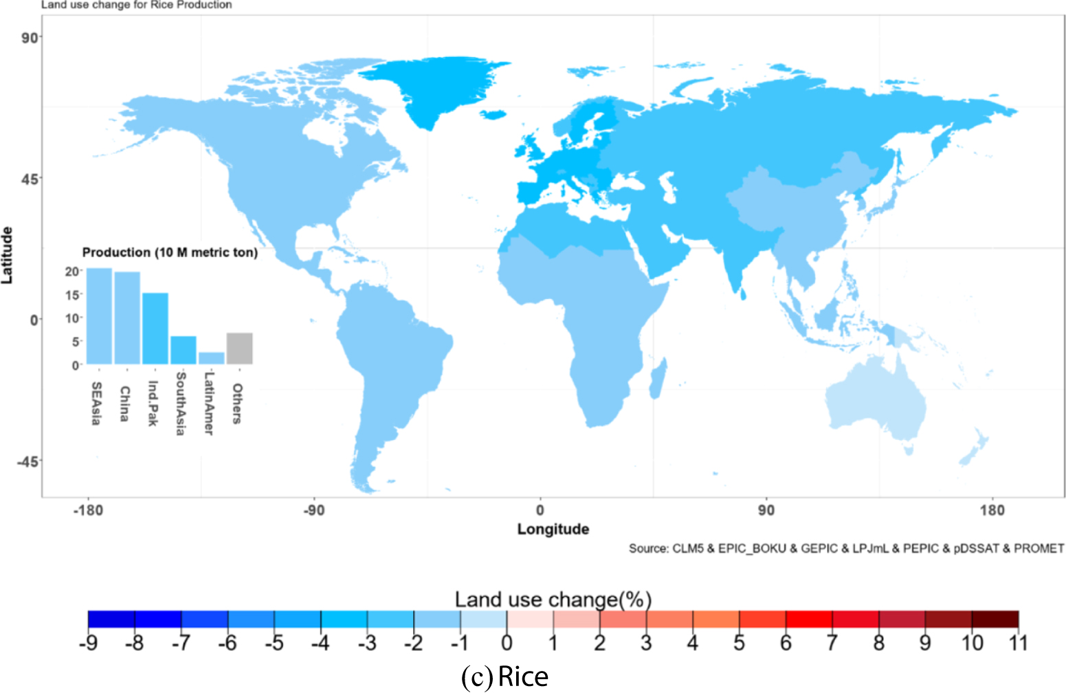 In CGE analyses, explicit factors used for production (e.g. capital, labor, and land) become important. Because the climatic change affects surface biophysical parameters relevant to agriculture production, we translate the simulated shocks to the crop models’ yield, which project the effect of the nuclear war on biophysical parameters, to the Envisage model through significant changes to land productivity.