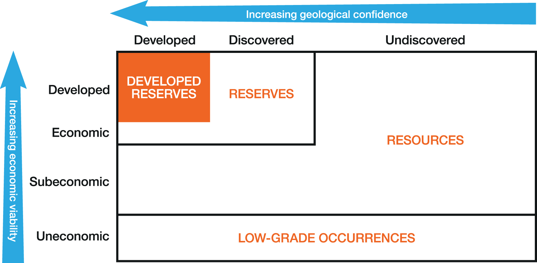Figure 1. Developed reserves in relation to total reserves and resources. In this analysis, a project-level final investment decision is the threshold for reserves to be developed. Boxes are illustrative and not to an exact scale. Adapted from McKelvey (1972).