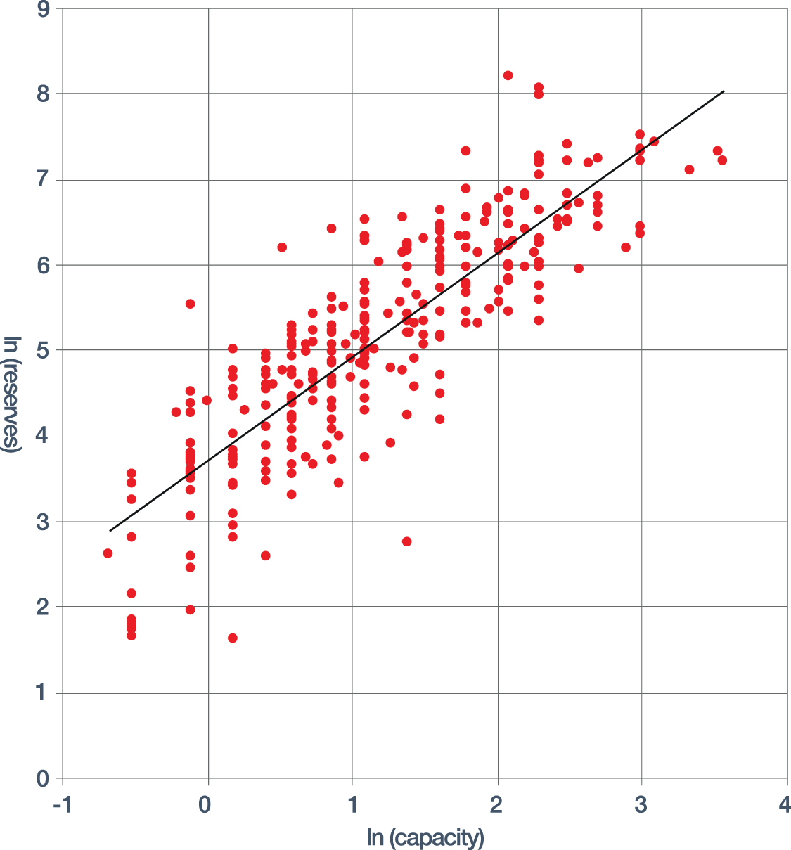 We conduct an ordinary least-squares regression of our sample using Long's (2009) generalisation of Taylor's (1977) rule for mine design, relating the scale of the mine (capacity, C) to recoverable reserves (R):
