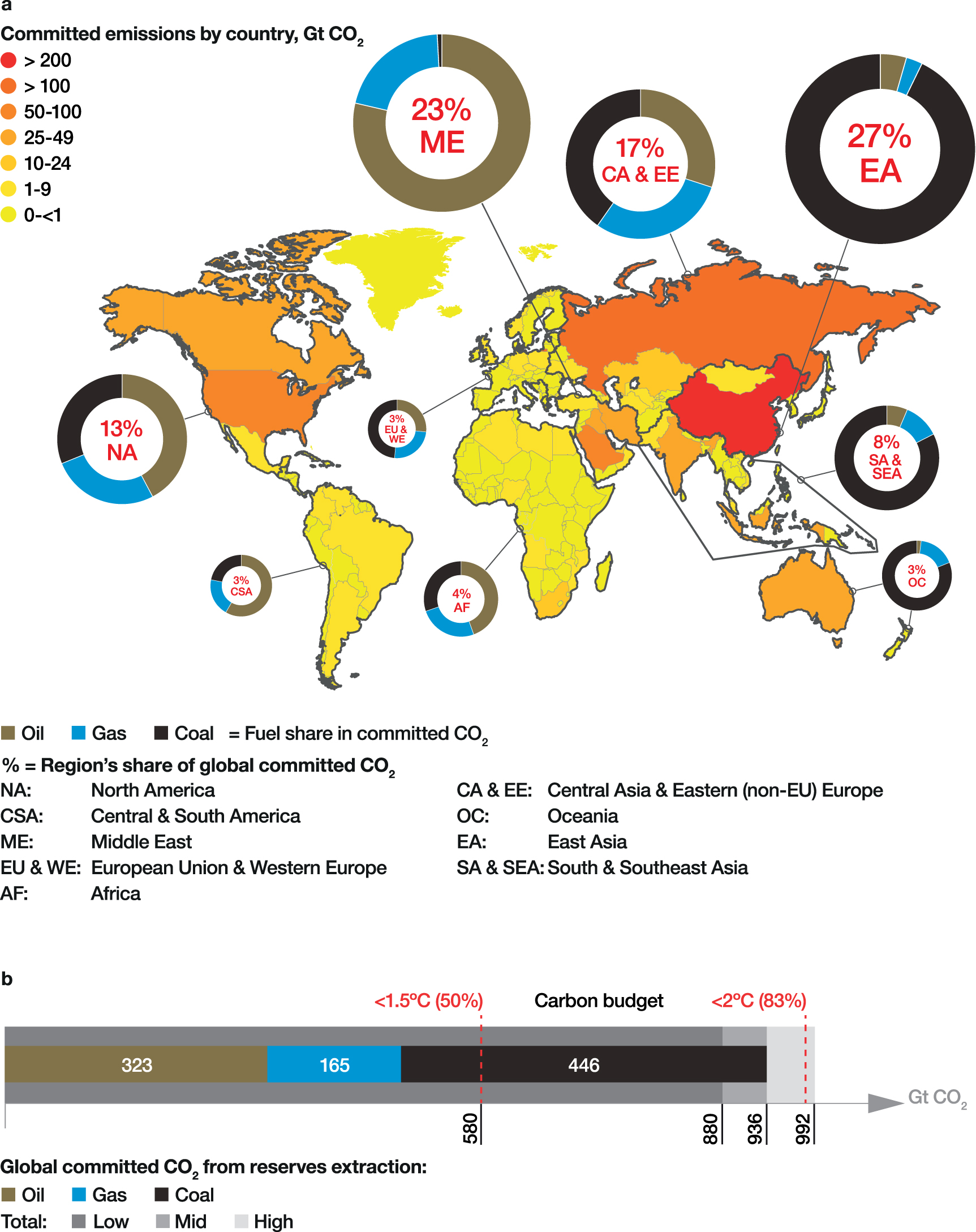 Figure 3. Distribution of committed CO2 emissions from developed fossil fuel reserves. (a) The map indicates shares of global committed CO2 emissions from extraction by region and by country. The % within each circle is the region's share of global committed CO2. Donut charts show the proportion of oil, gas and coal within the region's total committed CO2. The colour of each country corresponds to its concentration of committed CO2, as displayed in the legend. (b) Our estimate of total global committed CO2 by fuel compared to remaining 1.5 °C and 2 °C carbon budgets for given probabilities as of the start of 2018. The low-to-high uncertainty range displayed is the 90% confidence interval. Regions are defined in table S6.