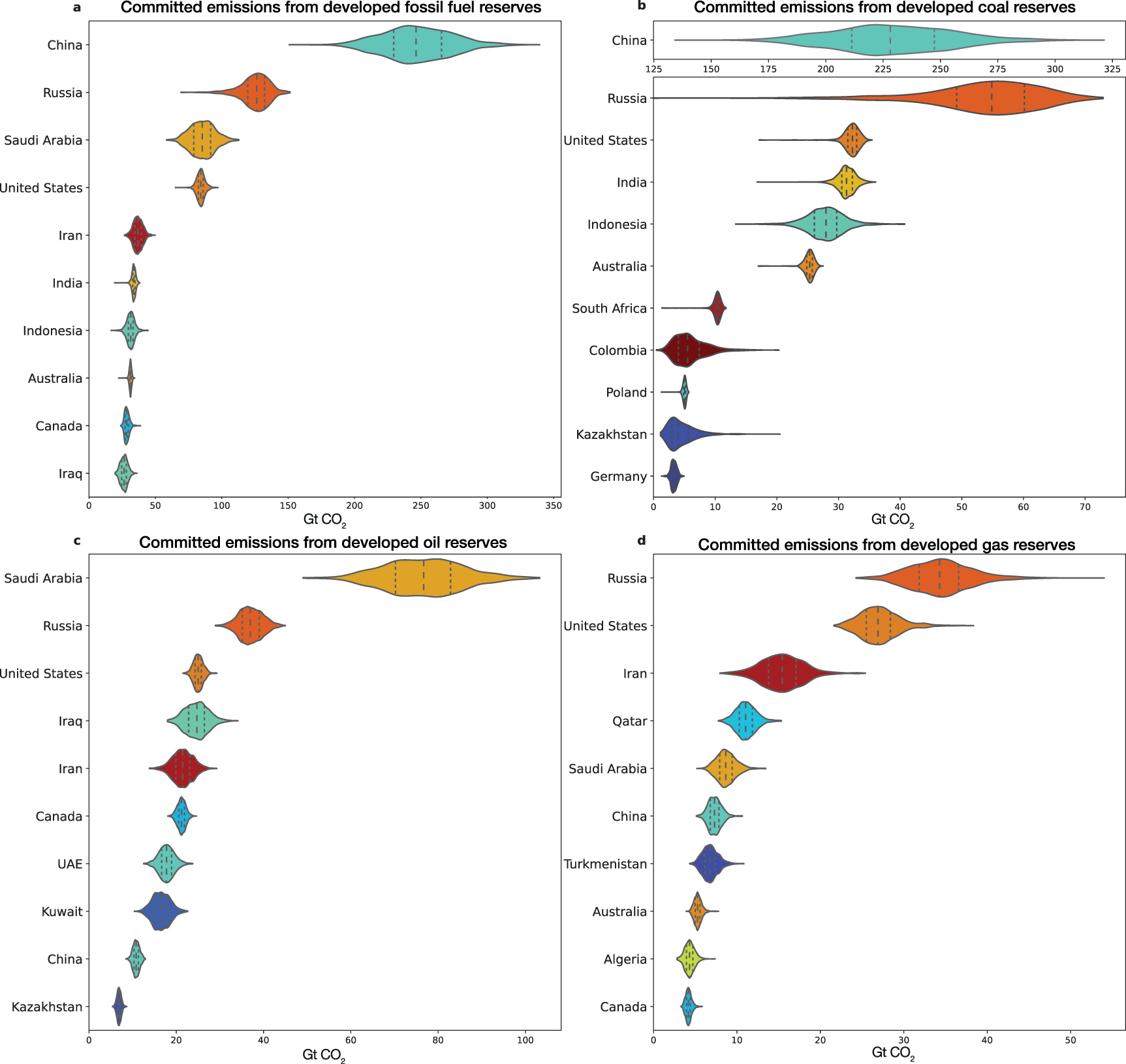Figure 4. Developed reserves and committed emissions by top countries, using violin plots to show probability distribution. The shape shows the kernel density estimation of the distribution for committed emissions for the given country from the 1000-run Monte Carlo simulation. The width of each shape represents the number of data points in that specific bin reflecting a range on the x-axis. It is widest around the median. The median and the first and third quartiles are shown as dashed vertical lines. The range shown is the total area of the probability density function. The countries shown represent the top ten for each parameter. (a) Committed emissions from developed fossil fuel reserves (coal, oil and gas combined) for countries with largest emissions. Committed emissions from developed reserves by country for: coal (b), oil (c) and gas (d). Figure S3 shows probability distributions for additional parameters.