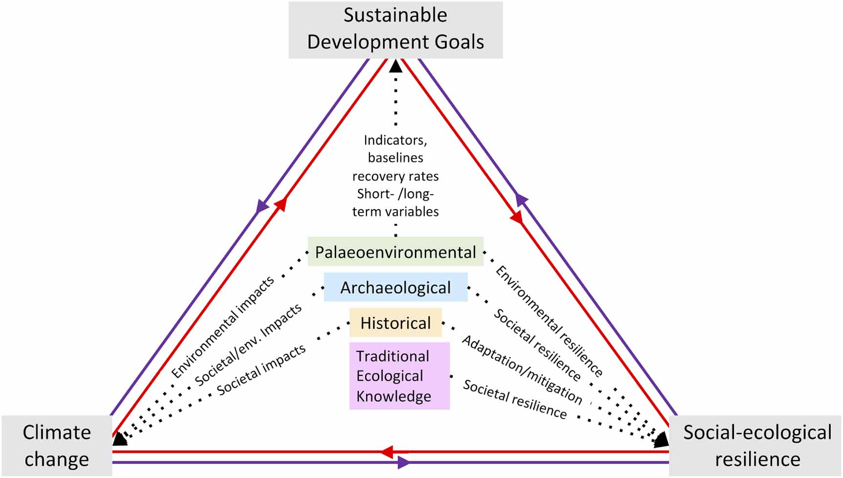 Figure 1. Simplified positive feedback loop between the sustainable development goals framework, social-ecological resilience and climate change. Contributions of historical, archaeological and paleo-data are central to understanding past environmental change, including responses to climate change and social-ecological resilience. Palaeo-data can also provide input into developing suitable indicators for some targets. If proceeding in a clockwise direction (red line), achieving the SDGs should enhance social-ecological resilience which then supports action on climate change and limitation of warming which then enhances the ability to achieve the SDGs. However, an anticlockwise (purple line) direction indicates that progress towards the SDGs falters which then negatively impacts on social-ecological resilience and impairs the ability to limit anthropogenic climate change. Escalating changes and reaching tipping points further undermines the ability to achieve the SDGs.