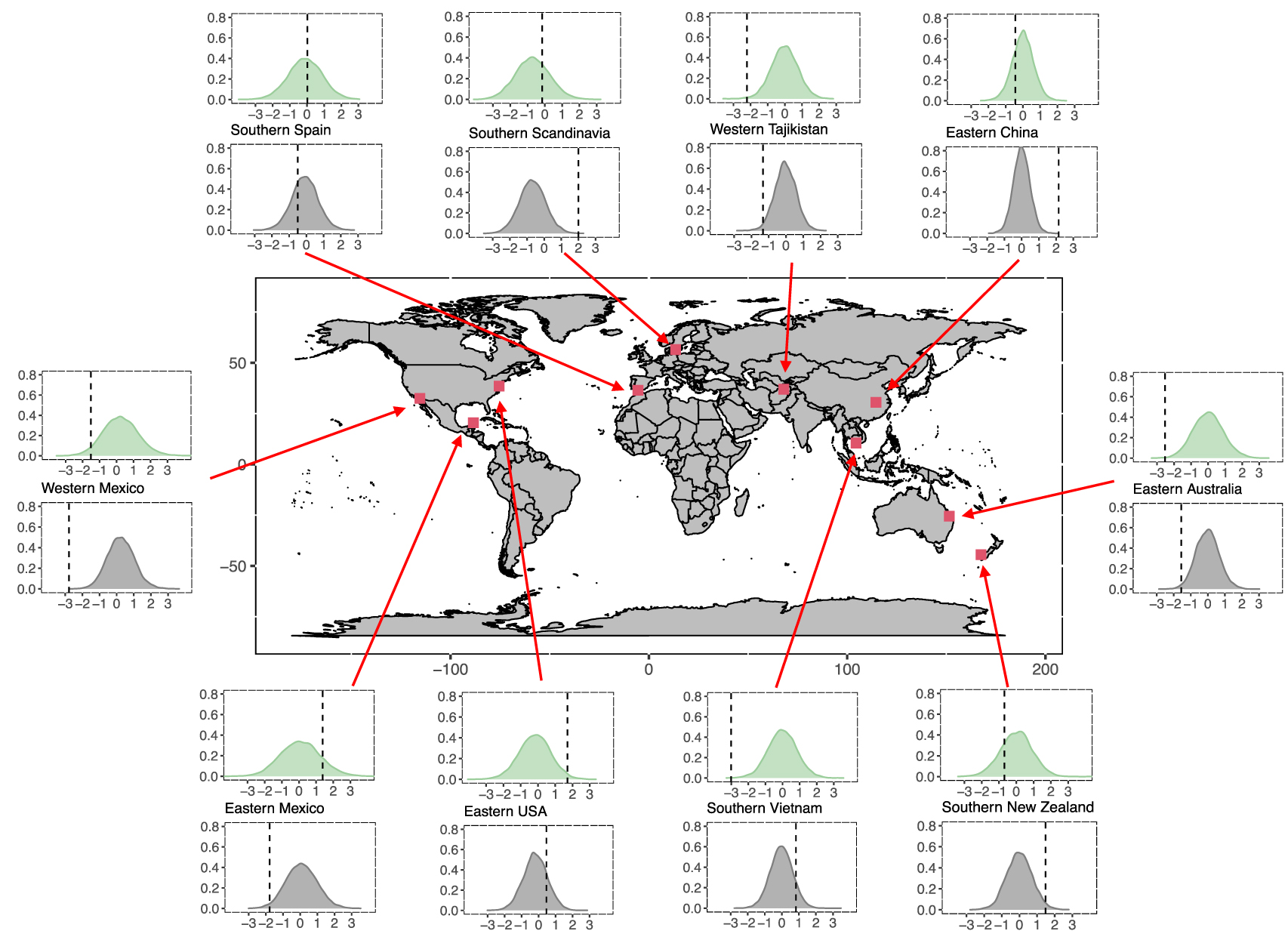 Figure 2. Comparison of average hydroclimate conditions over the 2000–2004 and 2016–18 baselines relevant for Target 6.6 (By 2020, protect and restore water-related ecosystems’) with distributions of 10 000 five- and three year mean hydroclimate for 3° × 3° areas around selected RAMSAR-listed wetlands (www.rsis.ramsar.org). hydroclimate conditions obtained from tree-ring based drought atlases (based on the self-calibrating palmer drought severity index) for North America (Cook et al 2007), Mexico (Stahle et al 2016), Europe (Cook et al 2016), Asia (Cook et al 2010) and eastern Australia/New Zealand (Palmer et al 2015). Green distributions are based on three year means (i.e. 2016–18 baseline), and grey distributions are based on the five year mean (i.e. the 2000–2004 baseline). Dashed vertical lines show where the baseline value sits relative to the distribution. Selected areas include: Yucatan/Campeche in Mexico (several wetlands); far northwest of Mexico includes several wetlands including Laguna Hanson, Estero de Punta Banda, Hunedales Delta del Rio Colorado; Eastern USA area includes Delaware bay Estuary, Chesapeake Bay Estuarine Complex and Edwin B Forsythe National Wildlife Refuge; Pyandi River area in Tajikistan; Awarua wetland in New Zealand; Great Sandy Strait in eastern Australia; area including U Mint Thuong and Cam Mau National Parks in Vietnam; area covering southern Sweden and eastern Denmark contains multiple wetlands; area around Cadiz in southern Spain contains several wetlands.