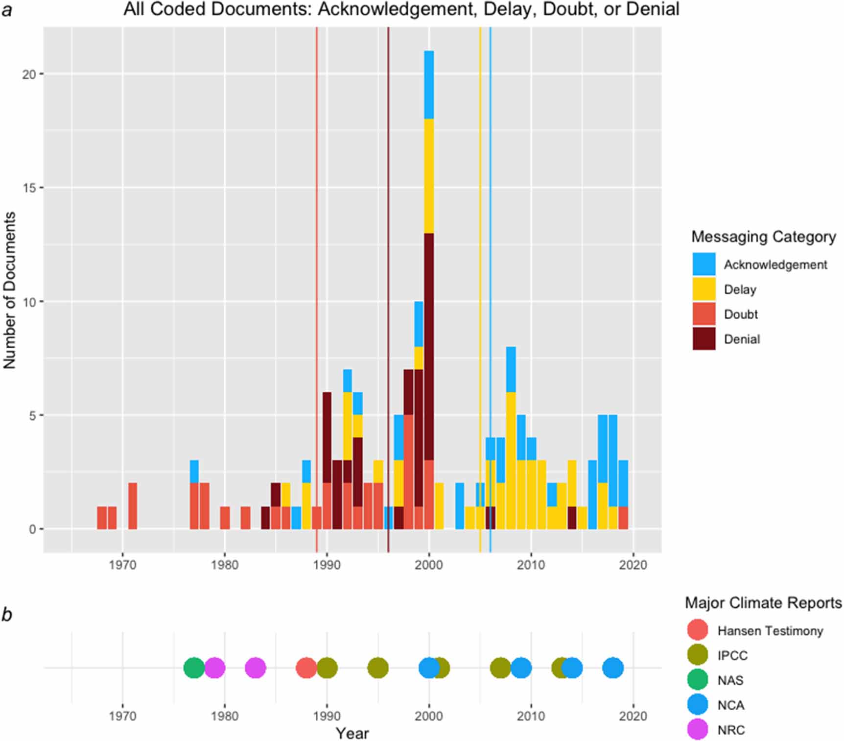 Figure 2. Temporal distribution of categorized codes for all documents (a). Taking the average year for documents in each messaging category, acknowledgement documents are centered in 2006, delay documents are centered in 2005, doubt documents are centered in 1989, and denial documents are centered in 1996 (years indicated as vertical lines). Major climate reports are shown (b) from the IPCC (olive), National Climate Assessment (blue), National Research Council (magenta), National Academies of Science (green), and Hansen congressional testimony (red).