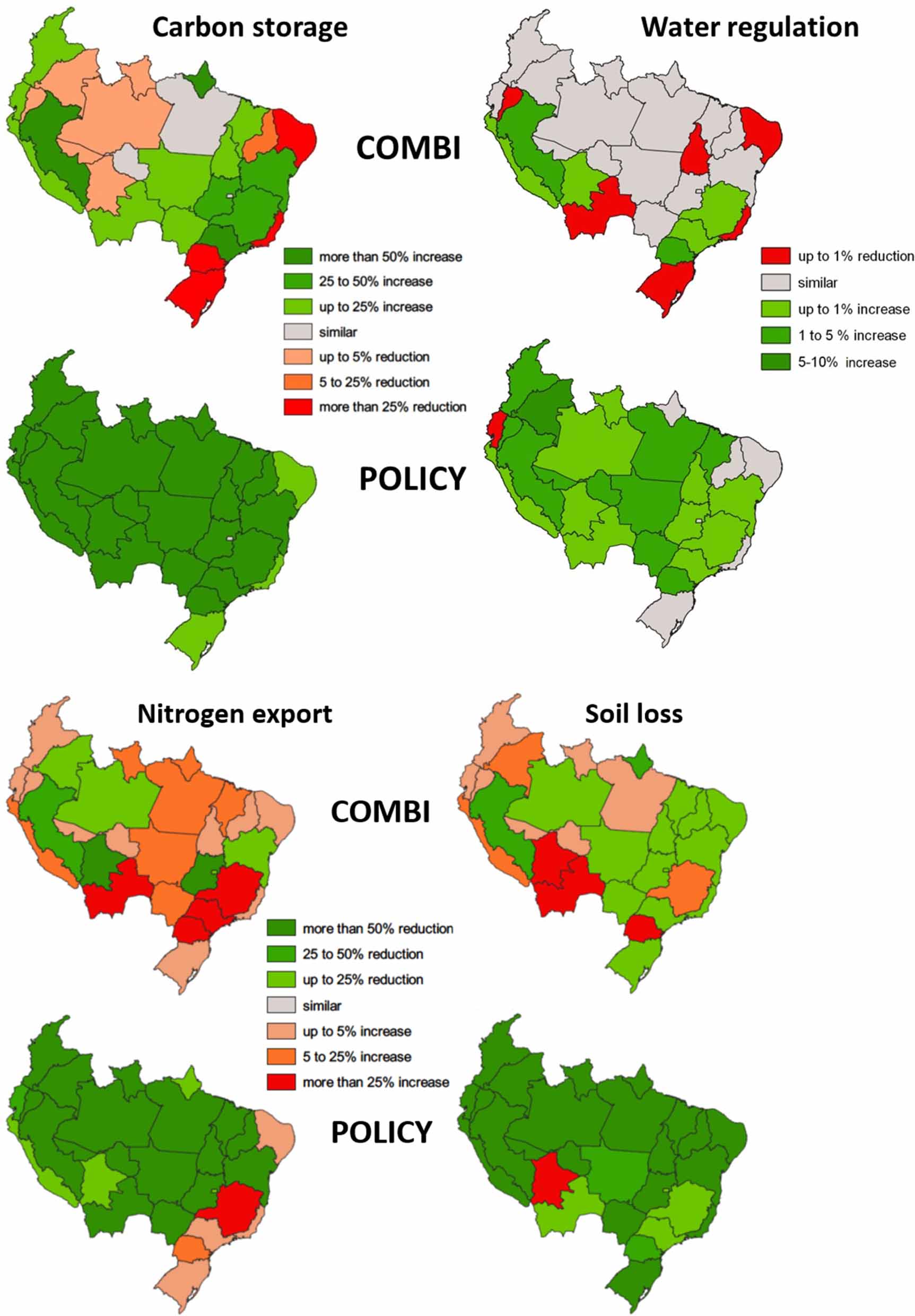 Standard image High-resolution imageFigure 3. Policy impacts on ecosystem services as a percentage difference between the policy intervention (POLICY) in 2050 and the Amazon tipping point (COMBI) scenarios. In the keys, green indicates a positive outcome, red indicates a negative outcome.