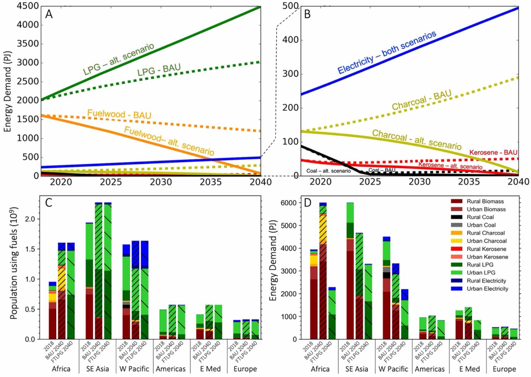 Figure 1. Energy demand in BAU (dashed) and FT-LPG (solid) scenarios (A) and the same graph zoomed in to show the less common fuels in more detail (B). The number of fuel users in 2018 and 2040 (C) and rural/urban energy demand by fuel (D) in 2018 and 2040 for all scenarios. (C) and (D) are disaggregated by WHO regions.