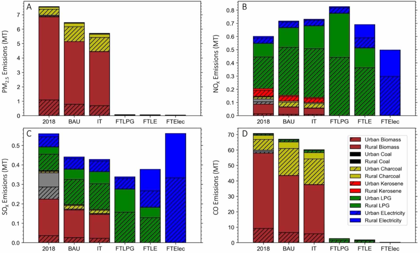 NOx emissions result primarily from atmospheric nitrogen and increase with higher combustion temperatures. LPG, coal, and thermal power generation occur at higher temperatures than biomass combustion in household stoves; therefore life-cycle NOx emissions are higher from LPG, gas and electric cooking [41]. SOx emissions primarily occur because of fuel-bound sulfur [42], which occurs in trace amounts in biomass but can be several percent by weight in coal [43]. Under the BAU scenario, NOx emissions increase by ∼20% between 2018 and 2040 and SOx emissions decrease by a similar magnitude (figures 2(C) and (D)). Under IT and FT-LPG scenarios NOx emissions increase further because of increased LPG consumption. In contrast, SOx emissions are lower in all scenarios relative to BAU except for FT-Elec. In that scenario, SOx emissions are nearly 30% higher than BAU due to increased coal-based electricity consumption (see SI section 10 for a discussion of regional variation in health-relevant emissions).