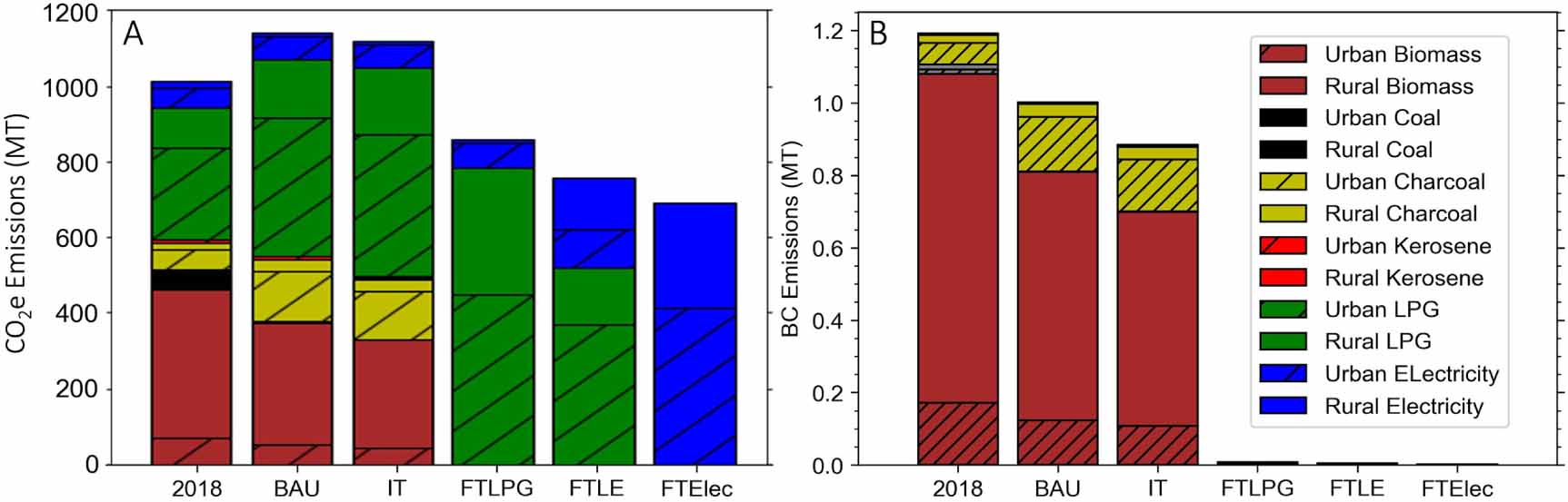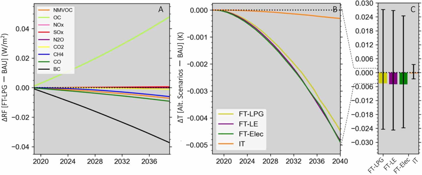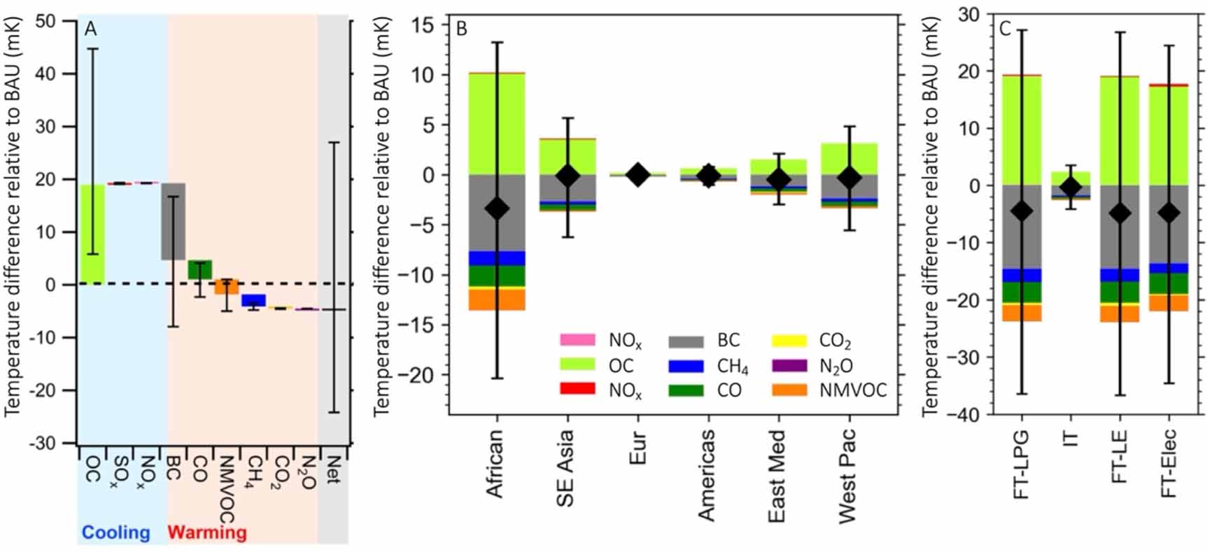 Incremental changes, illustrated by our IT scenario, result in modest reductions in climate forcers and negligible short-term temperature impact relative to BAU. In contrast, full transitions to LPG and/or electricity result in near elimination of the strongest SLCFs resulting in 4.7–5.2 millikelvins near-term cooling compared to BAU as well as substantial reductions of well-mixed GHGs that would contribute to long-term cooling. The same transitions result in near elimination of PM2.5. Under some scenarios, emissions of NOx or SOx increase, but the health benefits of zeroing out PM2.5 emissions from household sources would far outweigh the impacts of additional NOx and SOx . This is a rare example in which a fossil fuel-based energy transition can mitigate short- and long-term climate change while bringing large co-benefits: reduced health risks, time savings, and other social benefits associated with access to clean cooking options.