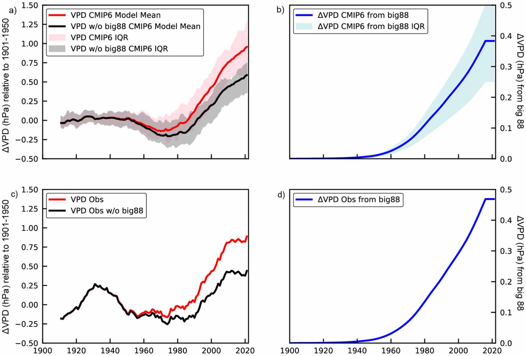 for each year by the ΔVPD/ΔGMT identified previously for each dataset. The VPD change contributed by the big 88 was calculated as the difference between the total modeled or observed VPD change and the counterfactual (equation (2)),