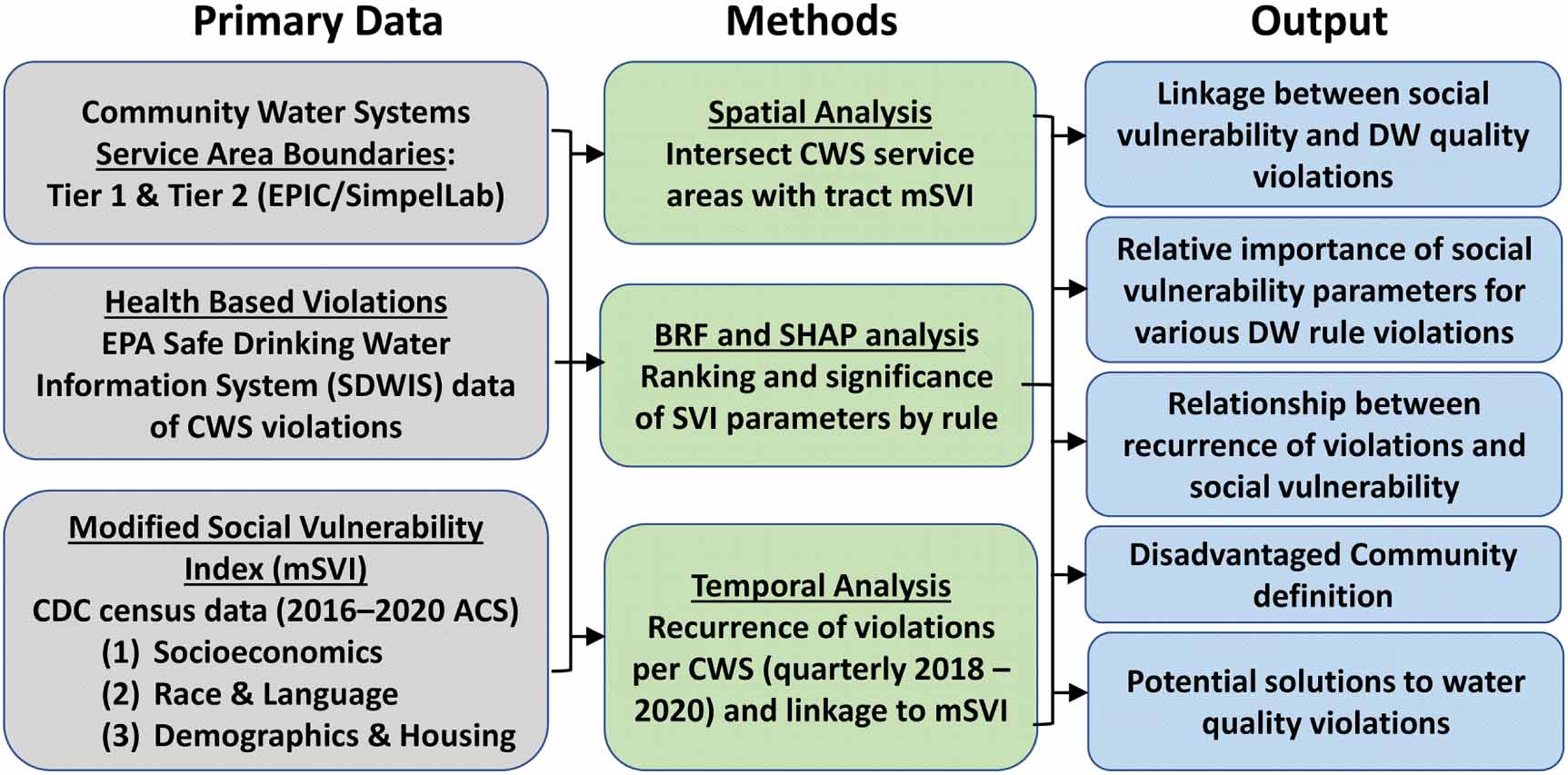 Unique aspects of this study include (1) use of a new dataset delineating CWS service areas rather than relying on county level data [16, 28], (2) considering all drinking water quality HB violation rules rather than focusing solely on an individual or subset of rule violations [18, 29–31] or point-source contaminants [22, 32]; (3) incorporating all CWS size categories as previous studies have excluded small CWSs serving ⩽500 people[24] or ⩽5000 [33], (4) evaluating CWSs throughout the CONUS rather than focusing on particular regions [34, 35], and (5) assessing linkages to various social vulnerability parameters relevant to drinking water rather than limiting to economic parameters [23] (figure 1). Further, we introduce a novel modified social vulnerability index (mSVI) specific to drinking water quality violations by using key parameters identified from previous studies and data analytics. Temporal analyses included evaluation of the recurrence of SDWA violations over a three-year period (2018–2020) and relationship to our mSVI. The comprehensive in-depth evaluation of drinking water violations and novel drinking water mSVI developed in this study can help inform an emerging US national water equity strategy, leveraging increasing funding opportunities available over the next five years through the federal Bipartisan Infrastructure Law.