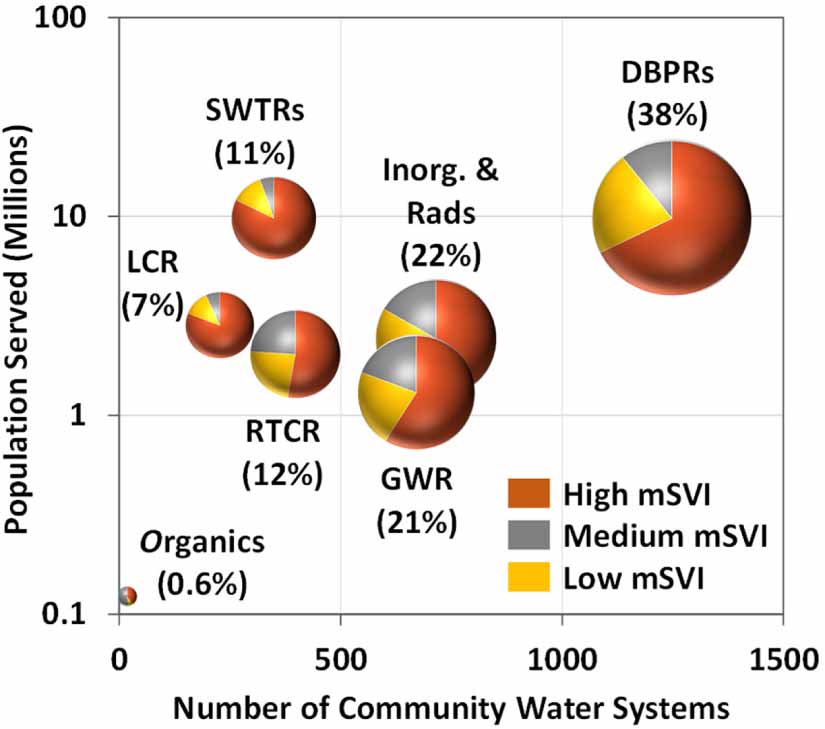 Recent national studies have evaluated drinking water quality violations in the US [16, 17]. Analysis of the dominant causes of SDWA health-based (HB) violations in CWSs shows that disinfectants and disinfection byproduct (DBP) violations related to water treatment were dominant [18], followed by naturally occurring contaminants (e.g. arsenic and radionuclides) and non-point source anthropogenic contaminants, especially nitrates [16]. Data analytics were used to determine dominant drivers of violations, including environmental (landcover, climate, geology), operational (water source, system size), and sociodemographic (social vulnerability, rurality) drivers. The Social Vulnerability Index (SVI) developed by the Center for Disease Control (CDC) [19, 20] was used in this study [16]. The CDC SVI was developed to address social vulnerability to natural (e.g. floods) or human caused disasters or disease outbreaks but not drinking water quality issues.