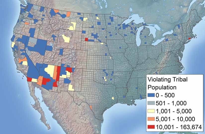 Figure 5. Map of population served by systems on tribal land served by CWSs with HB SDWA violations based on 2018–2020 data. Three out of ten people are susceptible to any HB violation in tribal CWSs. The analysis indicates that there was a total of 129 tribal CWSs (∼18% of all CWSs serving native Americans) with any HB violation serving ∼296 000 people (∼28% of the ∼1 million native Americans served by CWS) (table S20(e)). Only the Navajo nation has primacy.