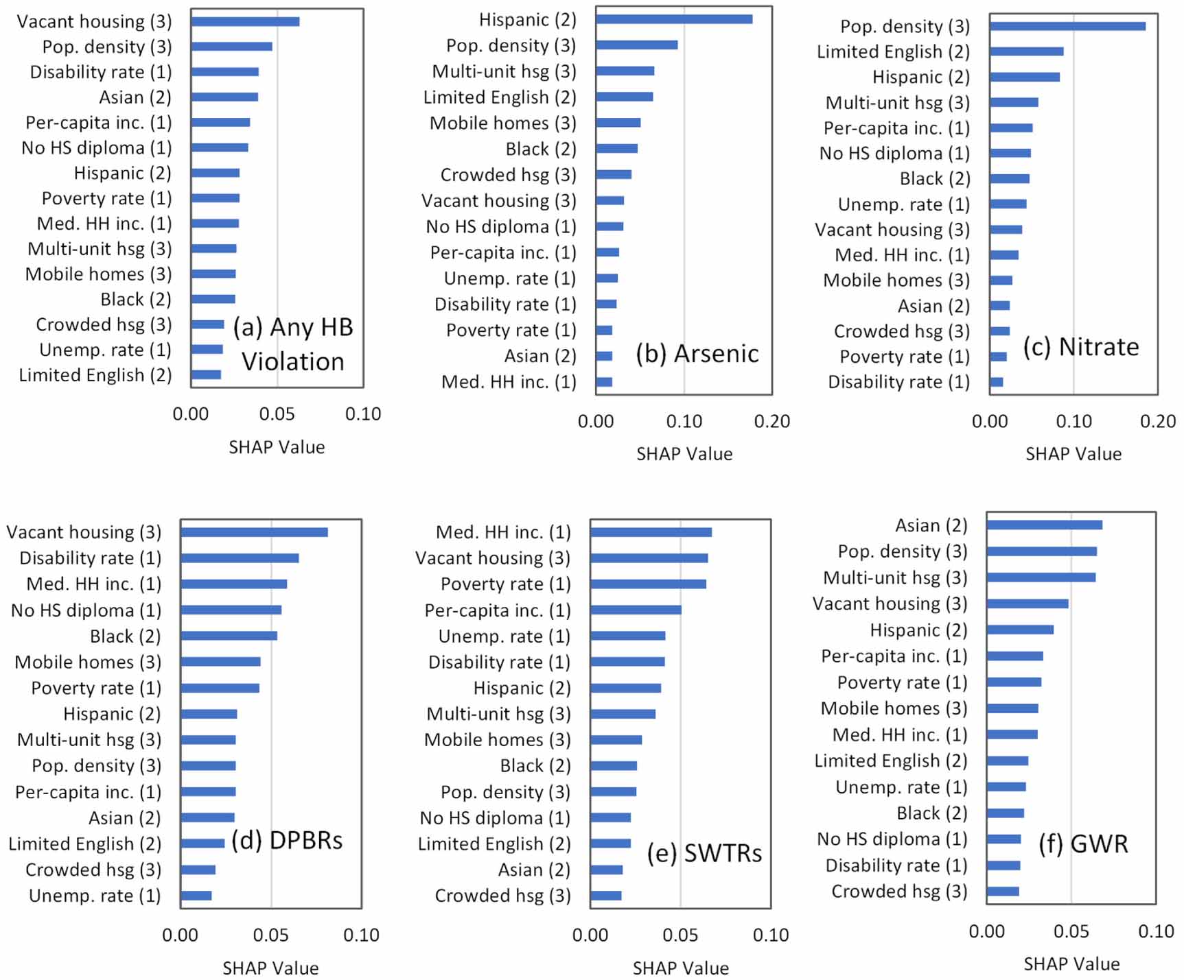 Figure 6. SHAP values showing relative importance of modified social vulnerability index (mSVI) parameters to (a) any HB violation, (b) DBPRs, (c) arsenic, (d) nitrate, (e) surface water treatment rules, and (f) GWR violations, based on 2018–2020 SDWA violations. SHAP values essentially represent the change in percent likelihood of incurring a violation. Numbers in parentheses refer to three SVI themes: 1: Socioeconomic Status; 2: Minority status & language, 3: Housing & population density; (figure S1). Data are provided in table S9(e). A more complete set of plots is provided in figure S11. Pop. density: population density; Per-capita inc.: Per-capita income; No HS diploma: No High-School diploma; Med HH Inc.: Median Household Income; Multi-unit hsg: Multi-unit housing; Crowded hsg: Crowded housing; Unemp. rate: Unemployment rate.