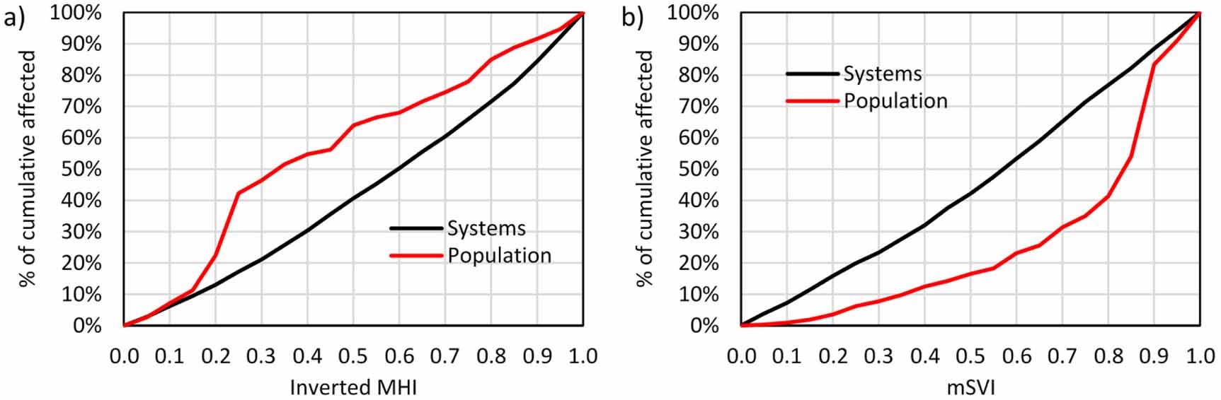 Figure 8. Comparison between (a) inverted median household income (MHI) scores and (b) modified social vulnerability index (mSVI) in assessingvulnerability of CWSs with any health-based violation. Inverted indicates the complimentary inversion (i.e. 1 − X) of the MHI score such that the lowest MHI dollar values are represented by the highest scores and vice-versa. See discussion in supplementary material section 2.9. Data are provided in table S4(b).