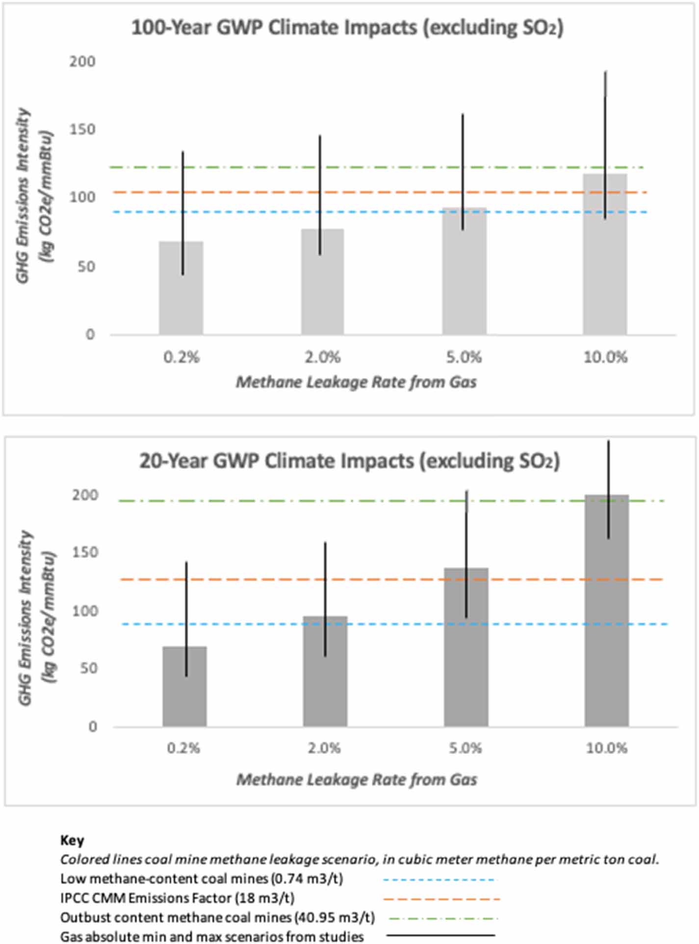 The climate impact shifts over a 20 year timeframe. Life-cycle GHGs from gas with a 2% leakage rate is on par with low methane content coal mines. And life-cycle GHGs from gas with a 4.7% leakage rate is on par with coal at IPCC CMM emission leakage rates. Gas systems leaking 5%–10% can be on par with outburst content methane coal mines, with a factor of over twice the IPCC emissions.