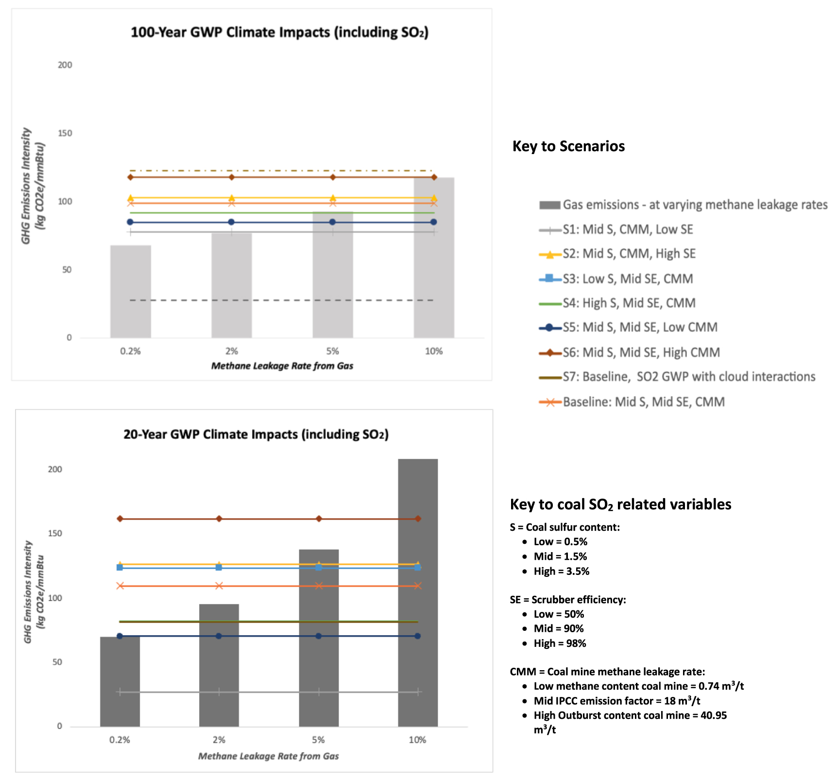 We build upon the baseline analysis by developing scenarios that affect the net climate impacts from gas at variable methane leakage rates. This includes the role sulfur emissions play in the combustion of coal, as shown in equation (g). In addition to the variables considered in the baseline analysis (GWP and methane leakage rates from coal and gas) additional variables are considered that influence net climate impacts of coal and gas. The variables discussed above (study inputs) include: sulfur content of coal, scrubber efficiency, and varying GWPs (table S2) for SO2 emissions. To calculate the net CO2e emissions from CMM leakage rates, we add GHGs from combusting coal, methane leakage from mines, and SO2 masking warming. The results are plotted in figure 3.