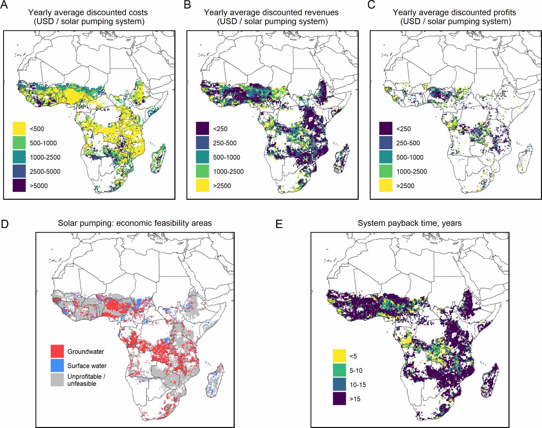 Figure 4. Local economic analysis of solar water pumping systems assuming a 20 year system lifetime and a 15% discount rate. (A) Yearly average discounted cost of a system inclusive of the pump, the PV system, and the battery, including initial investment and installation and O&M costs, as well as production and transport cost of yield to market. (B) Yearly average discounted revenues from increased crop productivity due to new irrigation assuming current cropping pattern and recent national crop prices. (C) Difference between yearly average discounted revenues and costs (for profitable areas only). (D) Economic feasibility areas and optimal water pumping sources. (E) Local solar pumping systems estimated payback time, in years.