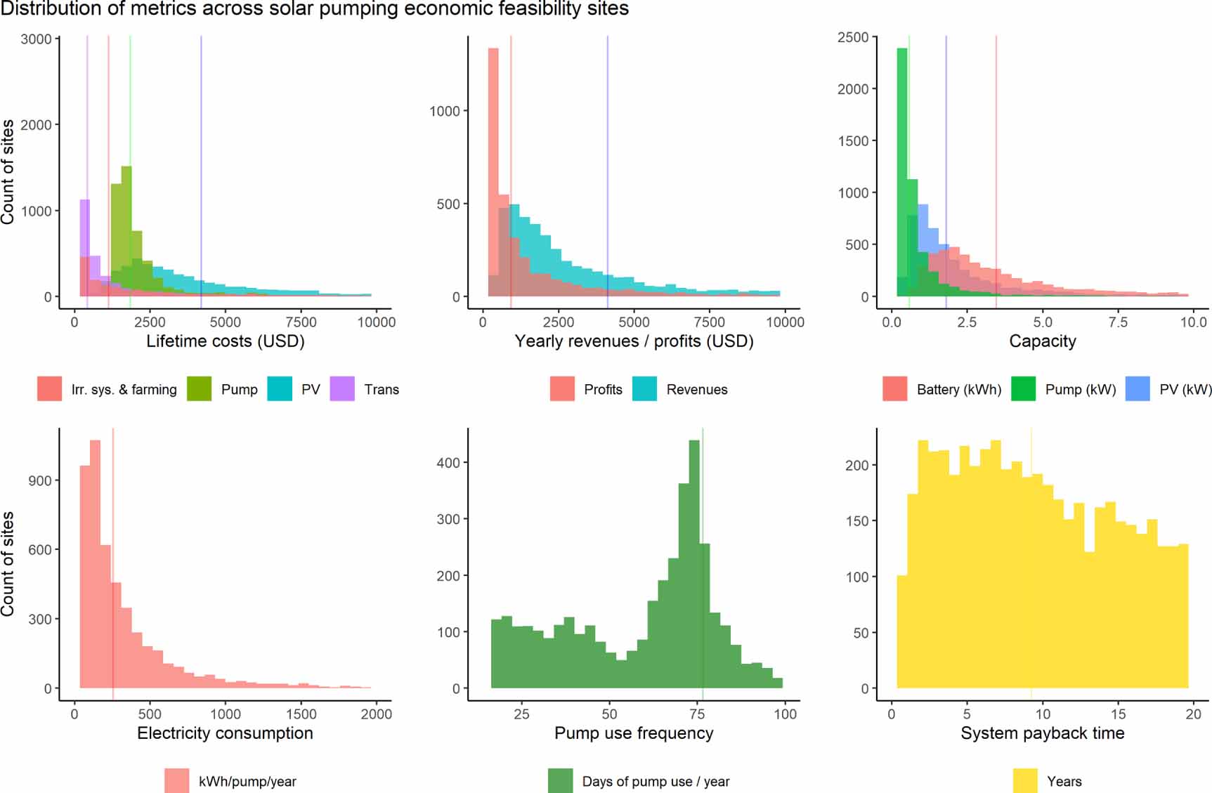 Figure 5. Distribution of solar pumping sites metrics across economic feasibility areas (A) Histogram of cost components; (B) histogram of revenues and profits; (C) histogram of technological requirements; (D) histogram of electricity consumption; (E) histogram of pump use frequency; (E) histogram of system payback time. Vertical lines describe the mean values in each variable distribution.