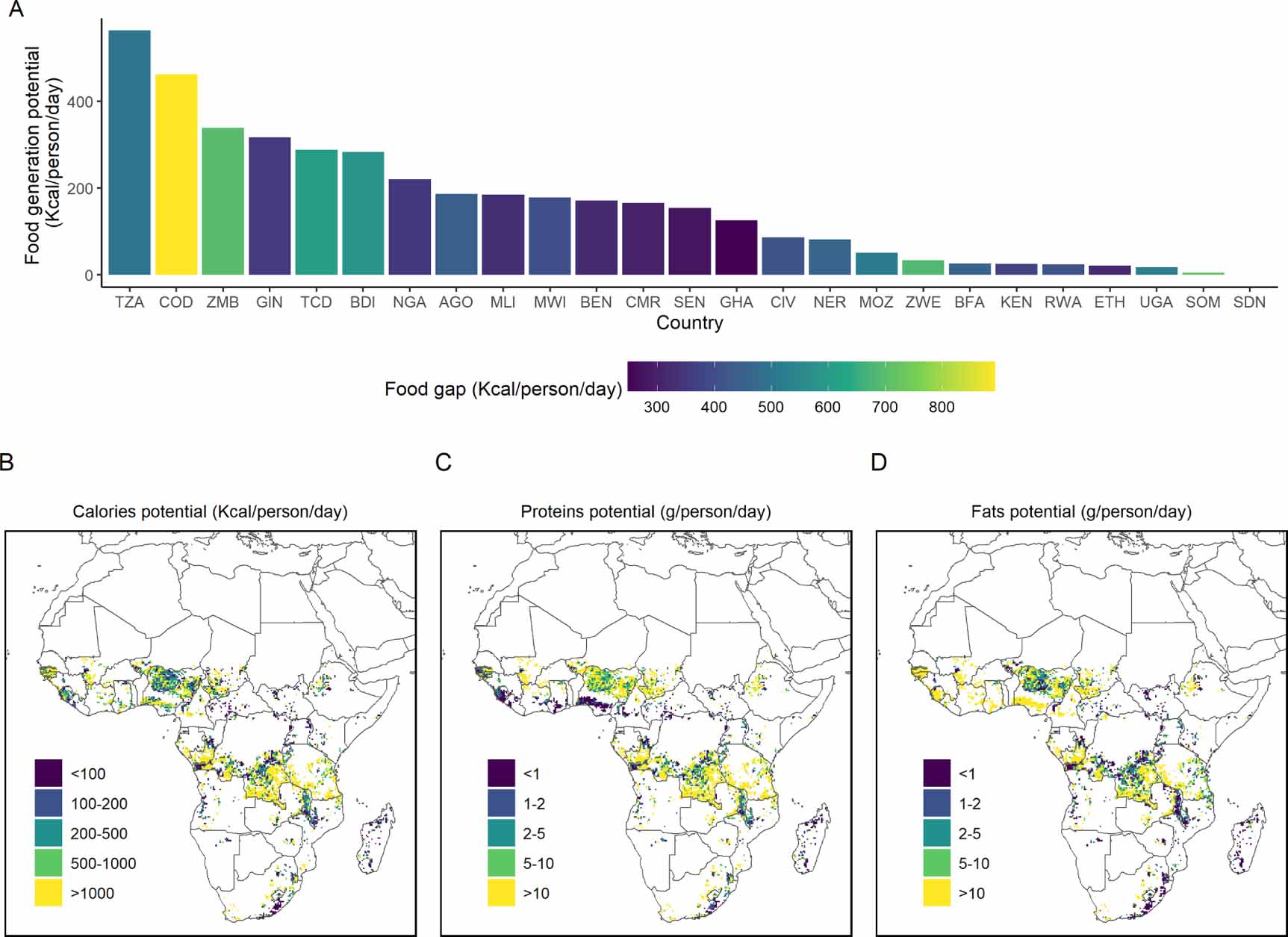 Figure 6. Food security implications of solar pumping adoption: country-level results for calories vs. food gap. The figures only depict of areas where solar pumping is found to be economically feasible. (A) Country-level (ISO3 codes) bar plot of potential total caloric generation potential due to crop yield growth induced by irrigation (x-axis) and current caloric gaps [60] (fill colour). (B), (C), (D) Maps of potential calorie generation potential (Kcal/person/day), protein generation potential (g/person/day) and fat generation potential (g/person/day). Note: country names are reported as ISO3 codes. The numbers of panel A are summarized in table SI9.