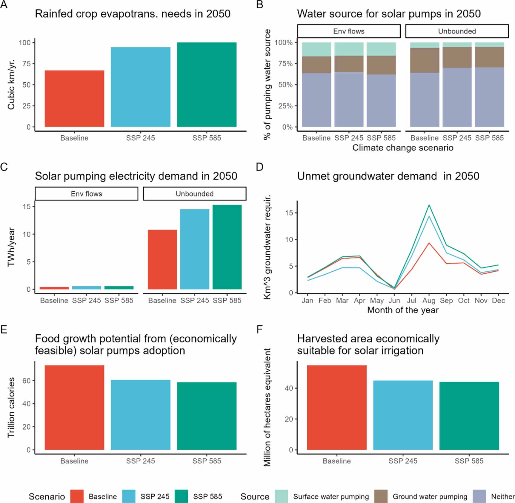 Figure 7. Climate change implications for irrigation and solar pumping feasibility in baseline climate, SSP245 and SSP585 scenarios. (A) Climate change impact on unmet rainfed crop evapotranspiration needs; (B) climate change impact on solar irrigation feasibility and shares of optimal withdrawal source in unbounded and environmental flows preservation scenarios; (C) climate change impact on pumping energy needs in unbounded and environmental flows preservation scenarios in sites where solar irrigation is economically feasible (in each scenario); (D) unmet groundwater irrigation demand due to climate change in the environmental flows preservation scenarios; (E) climate change impact on food yield potential due to solar irrigation adoption from cropland (harvested) area that is economically suitable for solar irrigation; (F) climate change impact on cropland (harvested) area that is economically suitable for solar irrigation.
