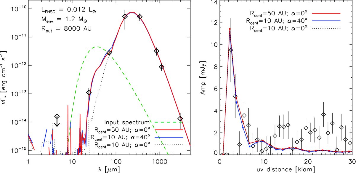 Figure 3. Best-fitting FHSC model compared to the observed SED (left) and CARMA 2.9 mm visibilities (right; Schnee et al. 2010) of Per-Bolo 58. While an FHSC provides a good fit to the SED, either a cavity in the inner envelope (Rcent ∼ 50 AU), or outflow (