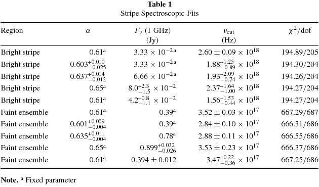 Standard image High-resolution imageAlthough it is clear that the bright stripe and faint ensemble spectra require different best-fit parameter values, in principle these differences might be due to either different cutoff frequencies or radio spectral indices. Our spectral analysis (detailed in Table 1) allows us to discriminate between these two options. When the spectra for the bright and faint regions are fit with radio flux densities fixed at their nominal values, both regions prefer an index very close to the average for the entire remnant. Conversely, if we instead require that both regions have the same cutoff, the fitted radio indices are α = 0.565 (bright) and α = 0.623 (faint). We cannot reject this level of variation outright since measurements of the spatial variation of the radio spectral index are not available for Tycho, though in Cas A (a plausible comparison object) the radio index does vary spatially by much as ±0.1 (Wright et al. 1999). On the other hand, the best fit for a single cutoff frequency is clearly worse (Δχ2 = 13.8) than for independent cutoff values. An F-test shows that the fit including independent cutoff frequencies is an improvement at a significance level of more than 3σ. Thus, we conclude that the cutoff frequencies are significantly different in the bright and faint spectral regions analyzed.