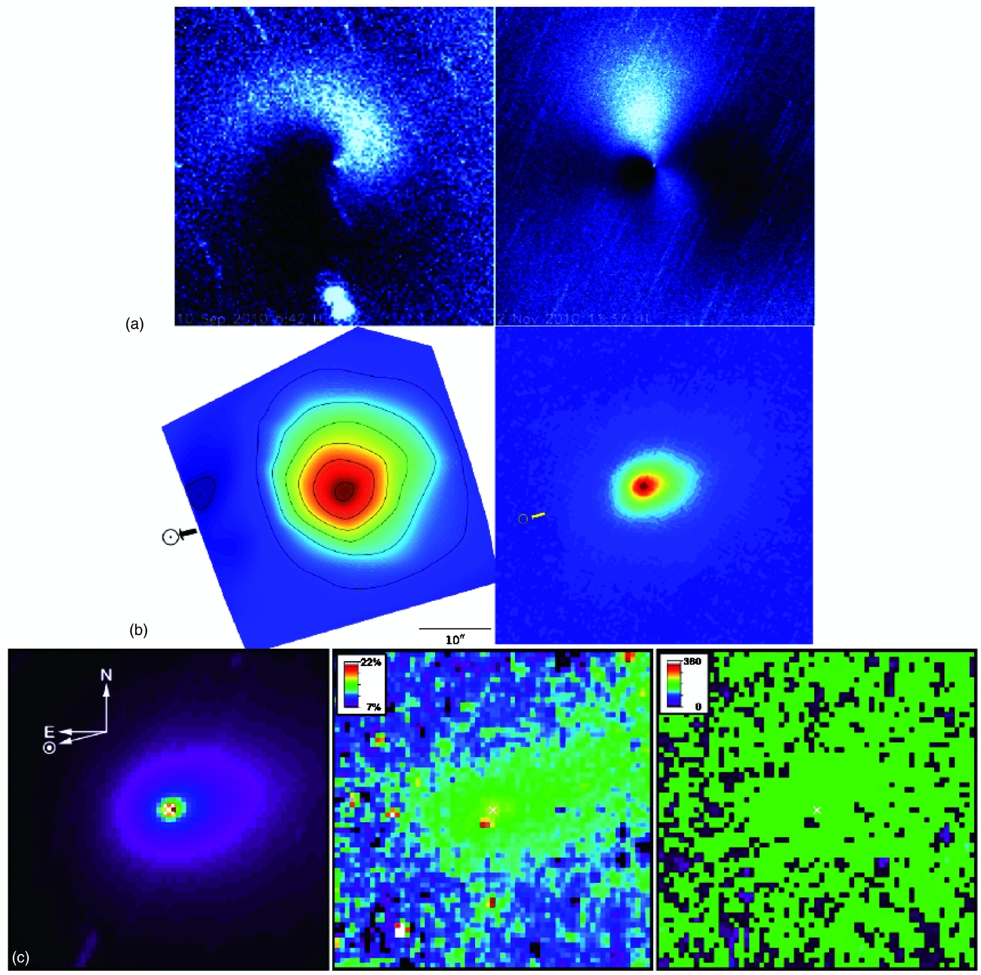 Figure 2. Appearance of the comet at different wavelengths. (a—top) Two enhanced CN images of the comet obtained from the Hall 1.1 m telescope at Lowell observatory on 2010 September 10 and November 2 showing the jet morphology change. Each image is ∼50,000 km across and oriented so north is up and east is to the left. (b—middle left) Map of the 221–212 water line (1661 GHz) obtained with the PACS on Herschel on November 4.55 UT. The 10'' scale bar corresponds to 1100 km at the comet's distance. (b—middle right) Image of the dust coma at 70 μm, 100×100 arcsec in size, obtained with PACS on November 4.47 UT. (c—bottom left) intensity map of the coma in i band on November 4 obtained with the 50 cm NOAJ telescope polarimetric imager. (c: bottom center) Linear polarization map, (c—bottom right) Position angle of the polarization plane relative to the plane orthogonal to the scattering plane. Scale is 186 km pixel−1. Arrows show the direction to the Sun.