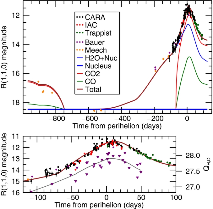 Figure 4. Top: composite photometric light curve of the comet brightness (within 5'' radius aperture) from the TRAPPIST telescope (green), the CARA consortium (black), the IAC-80 telescope (red), and data from Mauna Kea (orange) and Palomar (purple). For comparison, the best-fit H2O (blue), CO2 (orange), CO (green), and total (brown) model light curves are superimposed. The heavy horizontal blue line is the nucleus brightness. This shows water sublimation controlled activity from r = 4.3–1.4 AU, at which point CO2 outgassing from jets began to dominate (∼q–60 day) through perihelion, remaining active out beyond the date of aphelion. Bottom: enlargement of the light curve for 250 days around perihelion comparing the optical data and model fit (brown curve) with the water production rates (purple triangles), showing a peak in both dust and water production ∼10 days after perihelion.