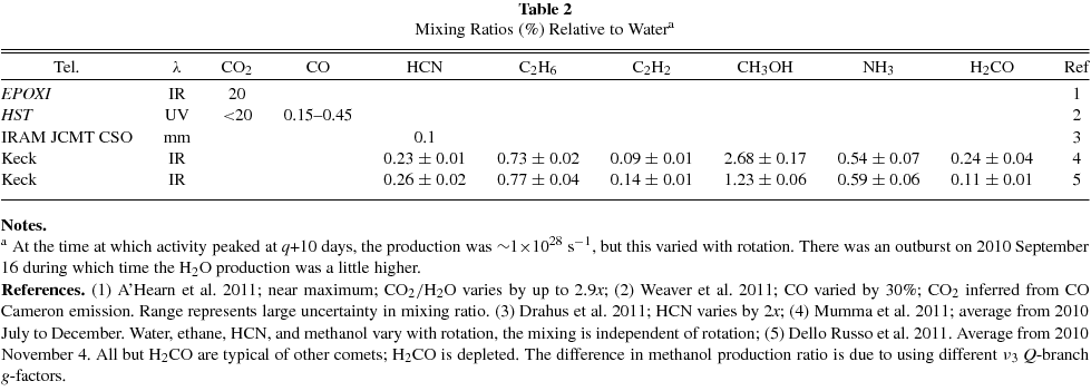 Notes. aAt the time at which activity peaked at q+10 days, the production was ∼1×1028 s−1, but this varied with rotation. There was an outburst on 2010 September 16 during which time the H2O production was a little higher. References. (1) A'Hearn et al. 2011; near maximum; CO2/H2O varies by up to 2.9x; (2) Weaver et al. 2011; CO varied by 30%; CO2 inferred from CO Cameron emission. Range represents large uncertainty in mixing ratio. (3) Drahus et al. 2011; HCN varies by 2x; (4) Mumma et al. 2011; average from 2010 July to December. Water, ethane, HCN, and methanol vary with rotation, the mixing is independent of rotation; (5) Dello Russo et al. 2011. Average from 2010 November 4. All but H2CO are typical of other comets; H2CO is depleted. The difference in methanol production ratio is due to using different ν3 Q-branch g-factors.