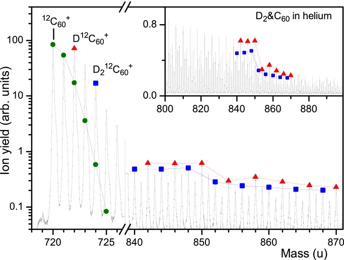 Figure 1. Sections of a mass spectrum recorded by electron ionization of helium droplets doped with C60 and D2. Solid circles indicate the expected abundance for C60 isotopologues. Squares and triangles mark Dx 12C+60 ions with x even or odd, respectively. The inset shows an extended part of the same spectrum.