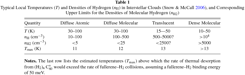 Table 1. Typical Local Temperatures (T) and Densities of Hydrogen (nH) in Interstellar Clouds (Snow & McCall 2006), and Corresponding Upper Limits for the Densities of Molecular Hydrogen (nH2)