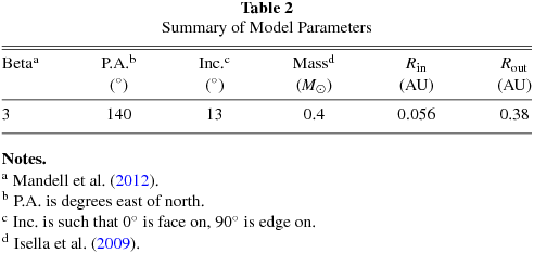 Notes. aMandell et al. (2012). bP.A. is degrees east of north. cInc. is such that 0° is face on, 90° is edge on. dIsella et al. (2009).
