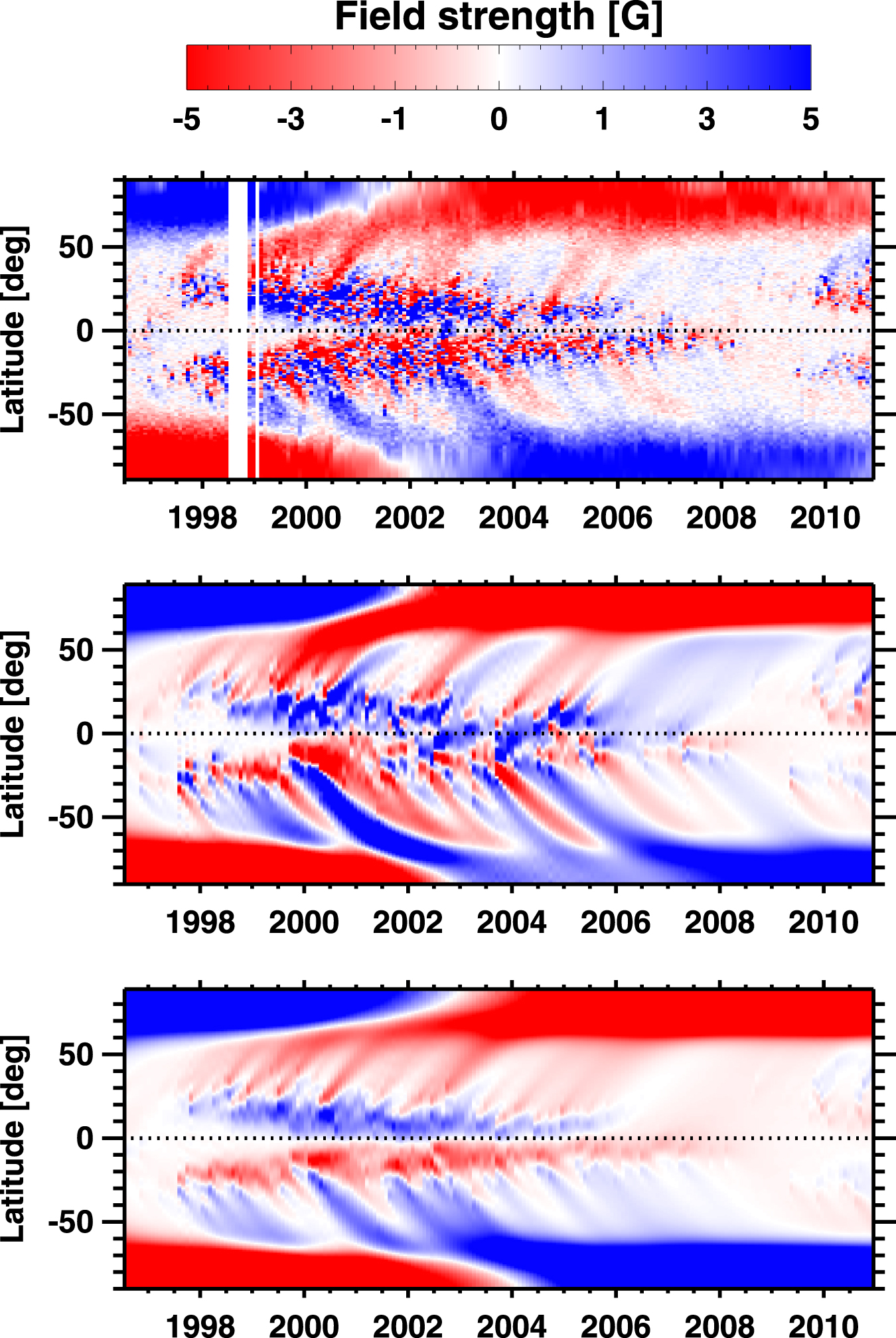 Figure 1. Time–latitude diagrams of the longitudinally averaged radial magnetic field at the solar surface. Top panel: observation (SOHO/MDI synoptic magnetic field data); middle panel: simulation using the actual tilt angles of bipolar magnetic regions; bottom panel: simulation using tilt angles according to a fitted latitude dependence.