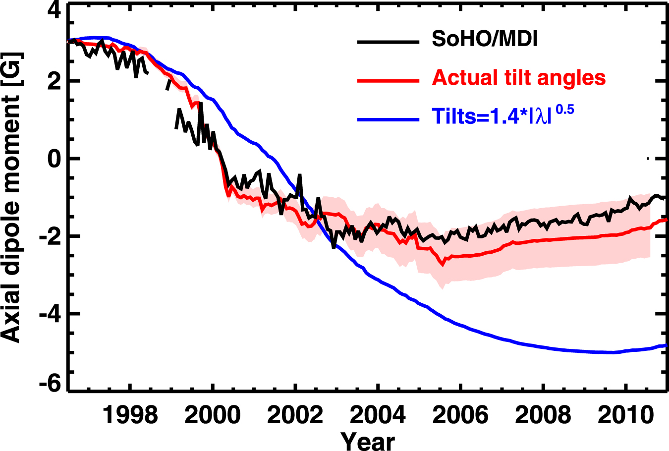 Figure 2 shows the evolution of the axial dipole moment as determined from observations (SOHO/MDI magnetic maps) and our SFT simulations. The simulation based on the actual tilt angles follows the observed evolution of the axial dipole moment well within the shaded error range (see below). On the other hand, employing Joy's law for the tilt angles leads to a much too strong axial dipole moment in the declining and minimum phases of cycle 23. This behavior is typical for previous attempts to reproduce the observed weak axial dipole moment and polar field by SFT simulations, unless the models were arbitrarily modified (e.g., in terms of meridional flow variations).