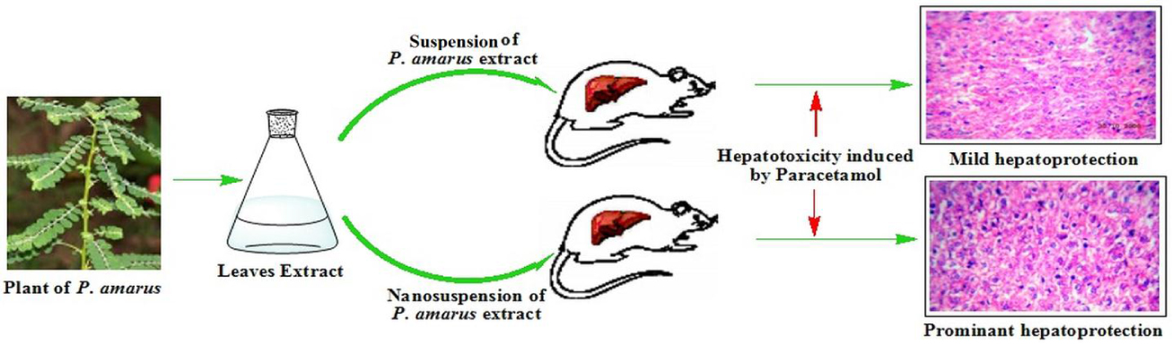 In the present study, our aim was to evaluate and compare the hepatoprotective effects of the ethanolic extract of P. amarus (PAE) and of its nanoparticles (PANs) on paracetamol induced acute liver injury in rats (figure 1). The hepatoprotective effects of the PAE and PANs were determined by assessing levels of total bilirubin (mg%), direct bilirubin (mg%), alanine aminotransferase (ALT), alkaline phosphatase (ALP), aspartate aminotransferase (AST) and also by examining the histopathological sections of the liver, all of which are associated with hepatic integrity.