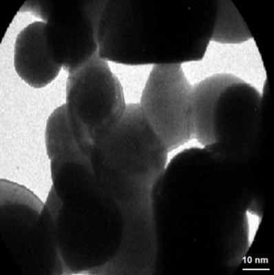 Figure 2 reports the TEM micro photomicrograph of the PANs. The picture reveals an irregular and asymmetrical morphology and solid dense structure, and processing the TEM image, the size of the particles resulted between 205 and 310 nm, according to the photon correlation spectroscopy (PCS) analysis.