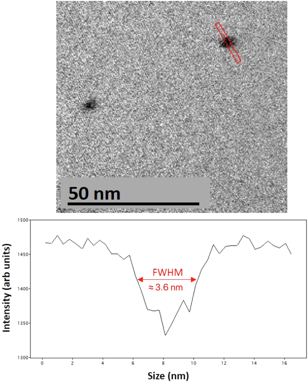 Figure 1. Illustration of how latent ion tracks are measured. The image on the upper is a HAADF STEM image with two tracks with an intensity profile from the track as indicated by the red rectangle. The profile itself is the bottom image.