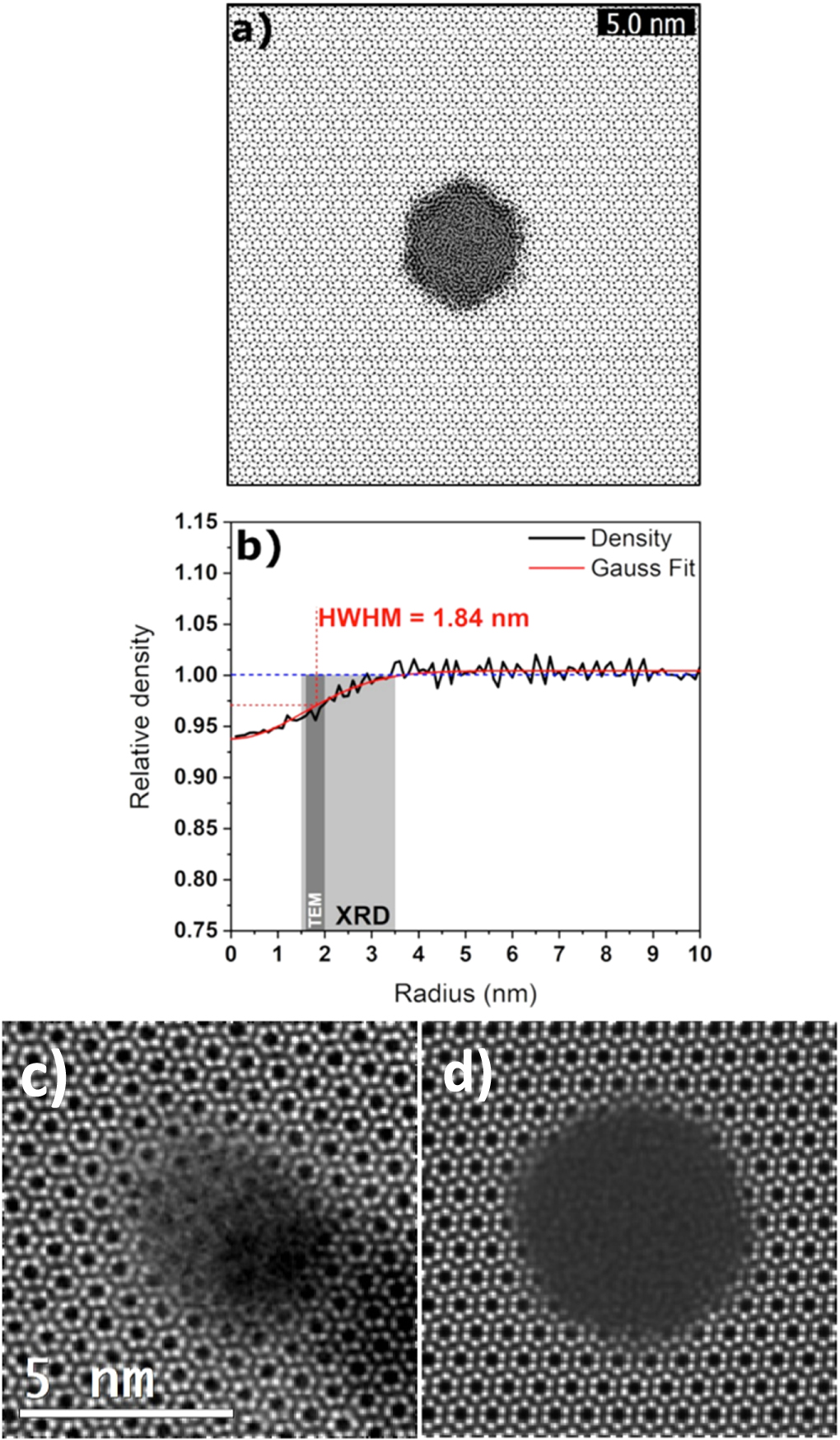 Figure 5. (a) Simulated ion track in silicon nitride at 150 ps after a passage of a Bi ion (710 MeV); (b) Normalized density variation as a function of radial distance from the track center as calculated from MD simulation. Grey rectangles show TEM and XRD track radius with errors. (c) Experimental HAADF image of slightly inclined track compared to (d) a simulated HAADF image from the MD simulation box.