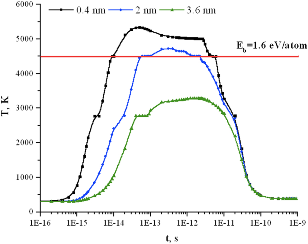 Unfortunately, to our knowledge, no information regarding the evaporation/boiling temperature and the latent heat of fusion is available for silicon nitride. The boiling energy Eb is therefore set equal to 1.6 eV nm−1 after fitting of the track radius versus the electronic stopping power as determined from TEM analysis [4, 18, 19]. The calculation of the time evolution of the lattice temperature in silicon nitride in a radial distribution from the Bi ion path (figure 6) demonstrates that the size of region where the boiling temperature is reached, i.e. the track core radius, is equal to 2 nm. The existence of a shell around the track core in crystalline Si3N4 has not been definitively proven, however some suggestion of the presence thereof has been observed during STEM analysis but is not yet conclusive and warrants further future investigation. This suggests that latent track core radii in polycrystalline Si3N4 irradiated with high energy heavy ions can be predicted by the i-TS model using the threshold energy Eb = 1.6 eV/atom.