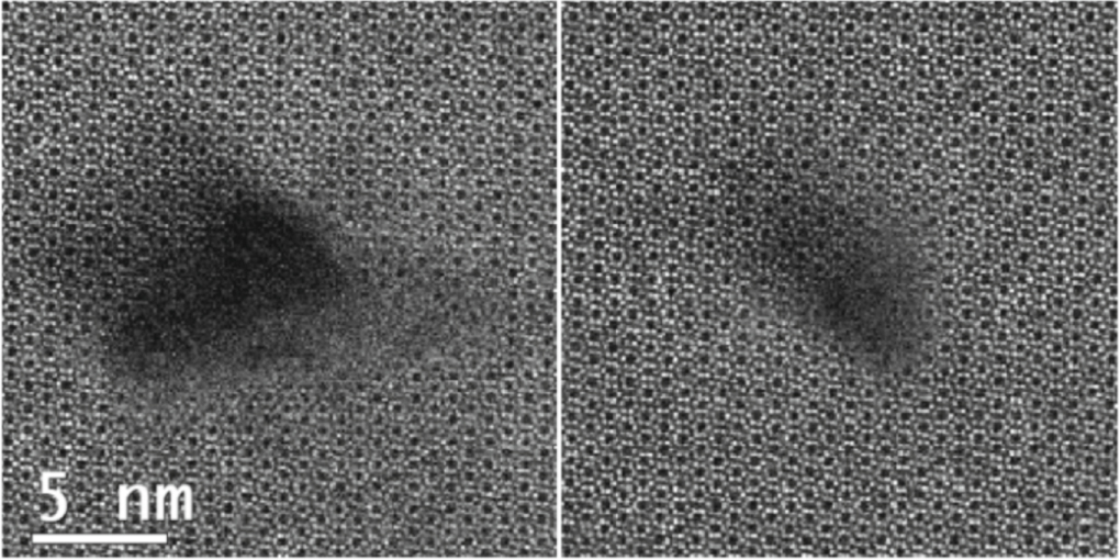 Standard image High-resolution imageIn figure 2 a single ion track induced by the passage of 710 MeV Bi is shown in both annular bright field (ABF) and high angle annular dark field (HAADF) imaging modes in a crystal which is oriented in the [001] direction. The ABF image contains a larger contribution of diffraction related contrast whereas contrast in the HAADF image is related to average atomic number along the projected column. The darker areas in the ABF image are therefore most likely related to strain within the crystal, induced by irradiation. A region of slightly darker contrast can be seen to the top left of the amorphous track core, in the HAADF image, which is as a result of a slight angling of the track away from the imaging direction i.e. a part of the track lying within the lamella is also seen. The amorphous nature of the track core can clearly be seen in both images at the position of intersection of the track with the top surface of the lamella. Since STEM imaging is mostly sensitive to the top surface of the specimen, the crystalline lamella surface is superimposed on the track contrast in the region where the track is below the surface. The average track diameter for 710 MeV Bi ions in polycrystalline Si3N4 is 3.3 ± 0.3 nm.