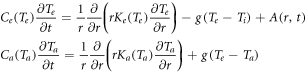There Ce, Ca are specific heat capacities, Te, Ta are temperatures, Ke, Ka are specific thermal conductivities (the indices i and e refer to the atomic (lattice) and electronic subsystems of the material, respectively), A (r,t) is the space-time source, describing the heating of the electronic subsystem of material by an incident ion.