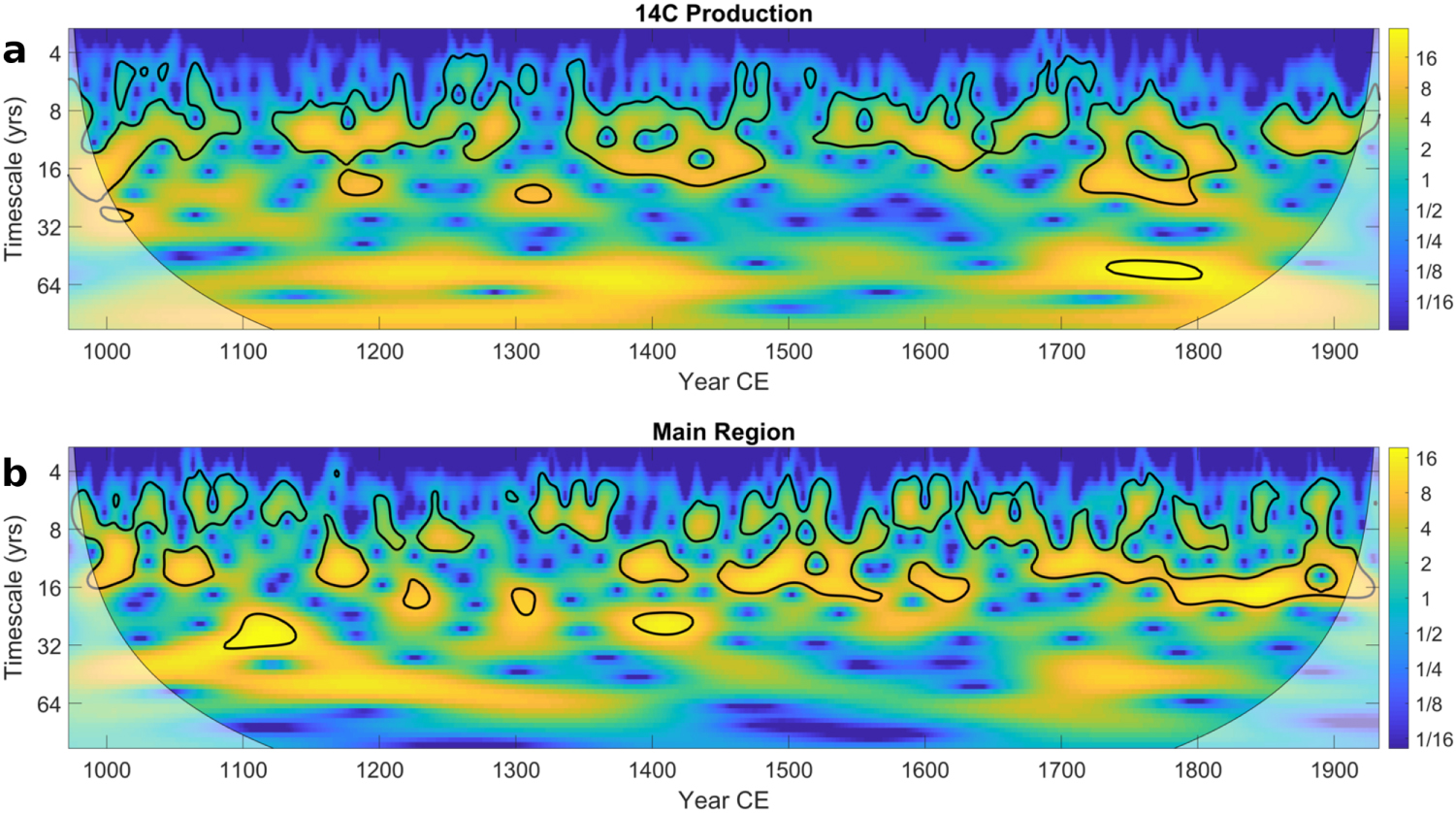 Figure 1. Continuous wavelet analysis of 14C production and Main Region tree-ring records during the past millennium. Continuous wavelet transform shows the spectral power in the time-frequency domain of a, the 14C production record (Brehm et al in pres ) and b, the Main Region precipitation reconstruction (Land et al 2019). The ∼11-year frequency is almost consistently apparent during the past millennium in both records. High spectral power in the ∼60 year band is also present in both records. The 5% significant level is indicated by the black line. Light shading shows the cone of influence where edge effects may have great influence.