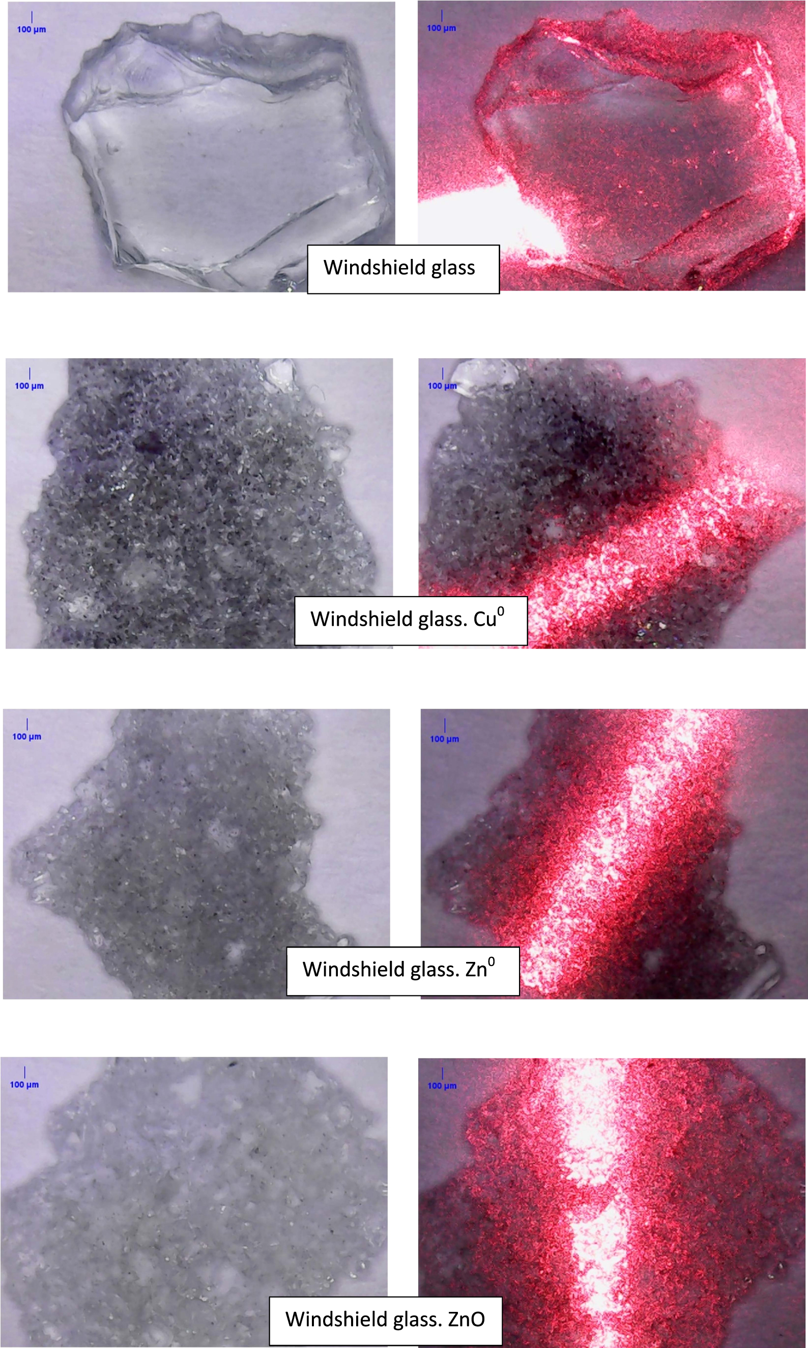 Finally, to reinforce this interpretation we observed the interaction between the modified glasses with a red laser beam. Figure 10 shows the optical microscopy images with a 1000× magnification (digital microscopy). Those images reveal that this beam interacts with the glass ceramic morphology. The presence of the metal microparticles is clear through the bright spots in modified matrices. Those microparticles are responsible for the high energy absorption shown by the UV–vis spectrum stronger for shorter wavelength values, even in the case of nonmetallic particles like ZnO as is expected for this oxide. Therefore, such results allow us to confirm that is the metal vibration the responsible phenomenon to develop the material appropriate for solar energy harvesting to be transformed in heat directly.