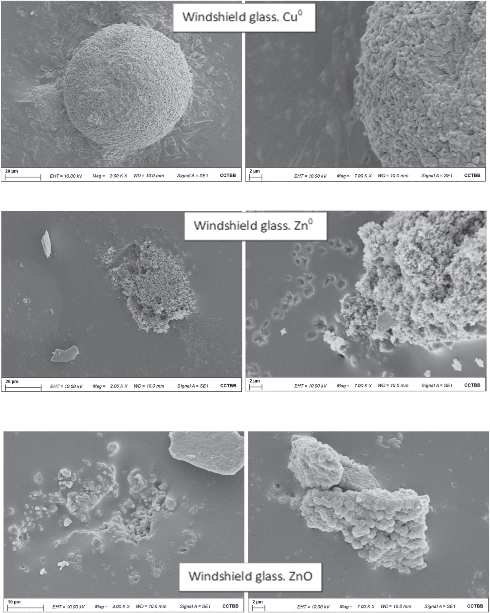 Figure 11. SEM images: Windshield glass. Cu0 (top), Windshield glass. Zn0 (middle) and Windshield glass. ZnO (bottom).