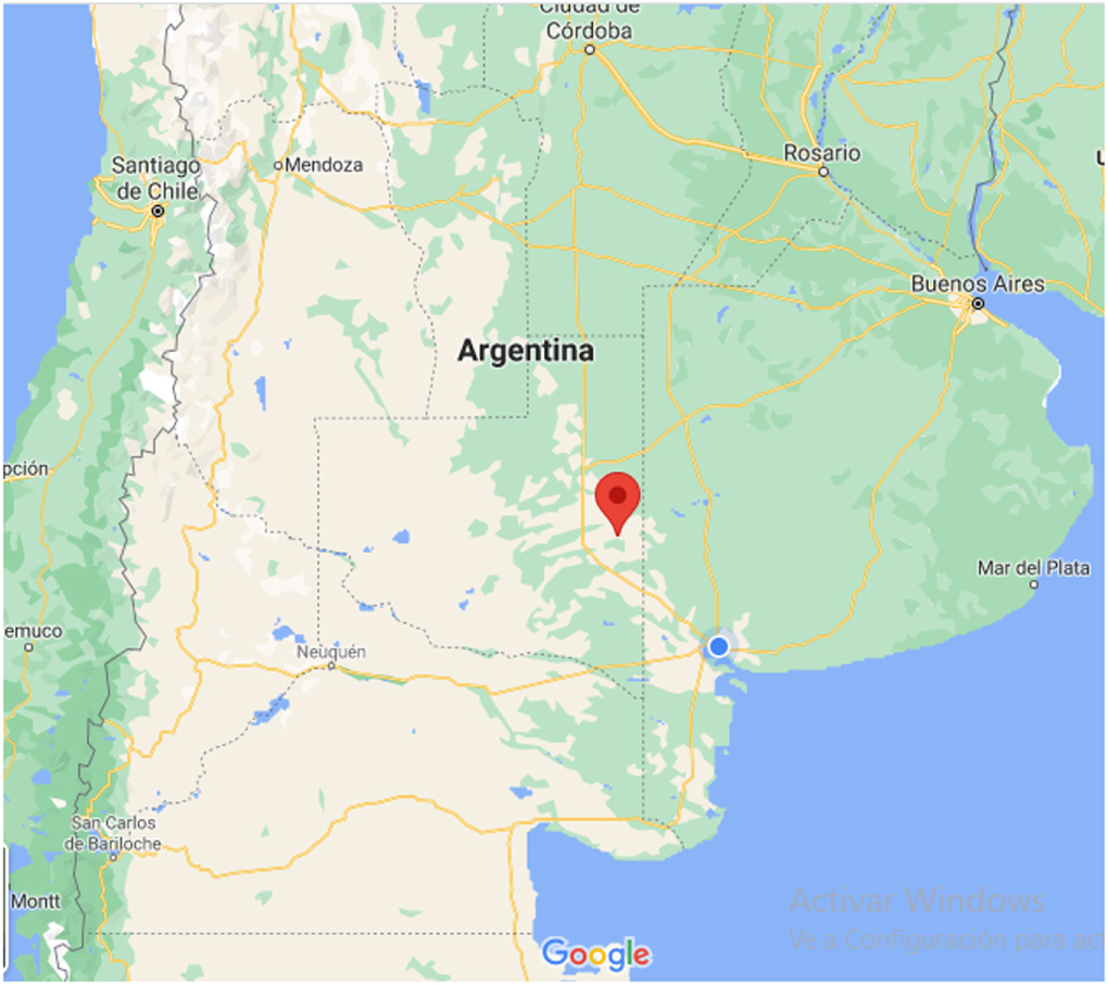 Figure 3. Alpachiri town (La Pampa- Argentina). Alpachiri's location, located at the east of La Pampa, Argentina; Datos del Mapa ©2021 Google).
