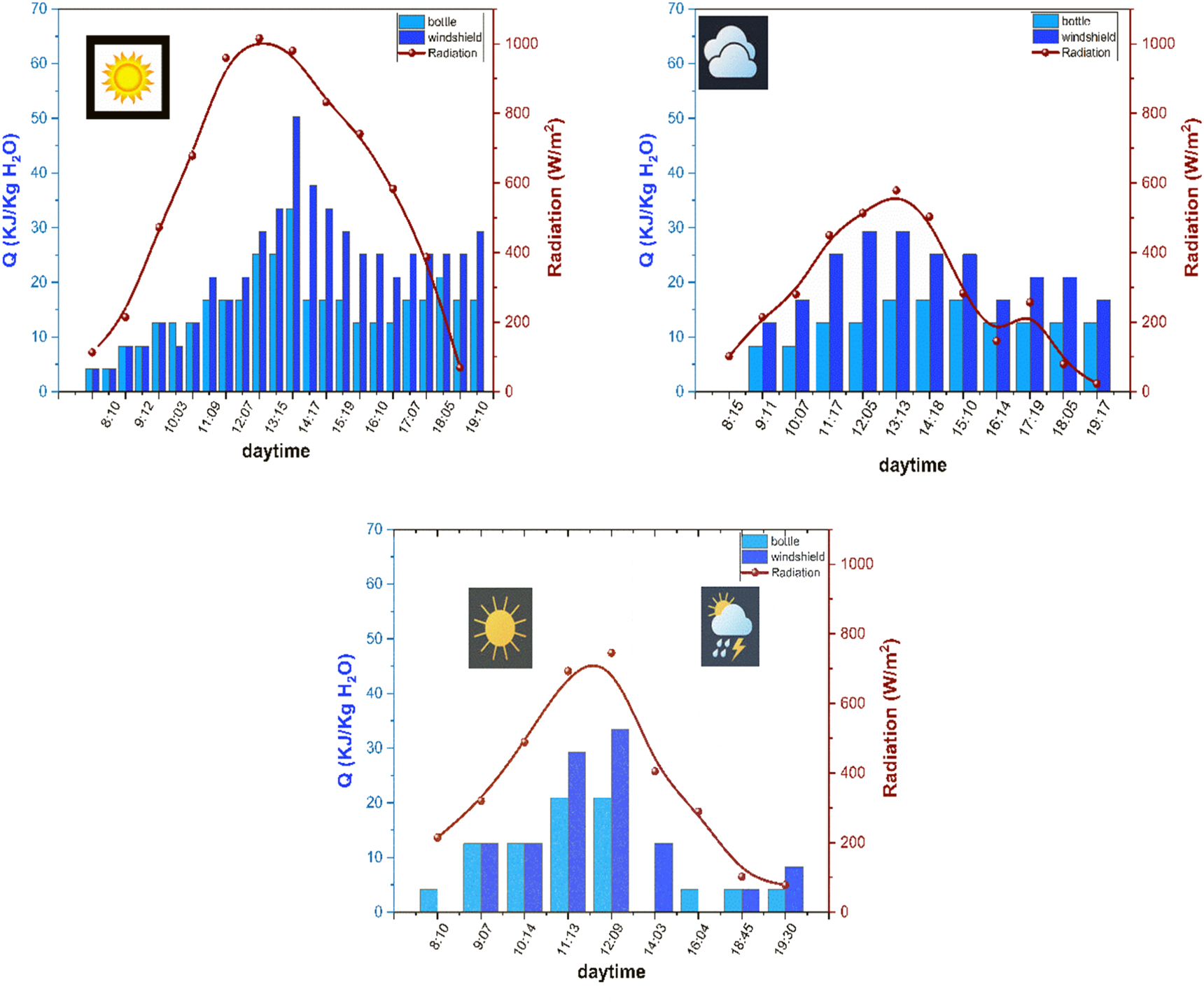Standard image High-resolution imageFirst, to determine if the efficiency of windshield glass is higher than standard glass (bottle glass in this case), we compared the effectiveness of heat absorption in water along the daytime and with different weather conditions. Figures 5(a)–(c) show the energy absorbed (Q [KJ/Kg H2O]) by the water as a function of the daytime in comparison to the solar radiation reported by Meteoabahía [20]. The obtained results allow showing that the windshield glass has a better performance given the chemical composition since the metal cations present in such glassy matrix make favorable the energy absorption, which is 20 to 30% higher than the amount obtained in the case of the bottle glass, even during the cloudy time.