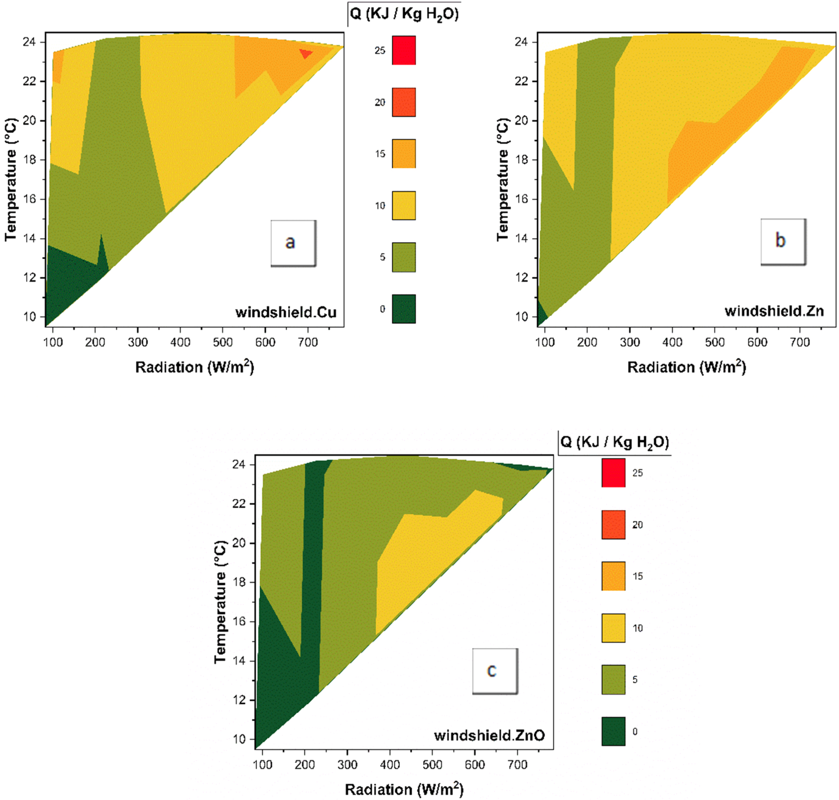 Figure 8. Q values obtained for each modified glass is plotted on a X-Y plane given the ambient temperature as a function of the solar radiation reported. The net energy absorbed Q by the water is presented through the same color scale for all as it is indicated in the legend. (a) Windshield glass. Cu0, (b) Windshield glass. Zn0 and (c) Windshield glass. ZnO.
